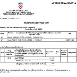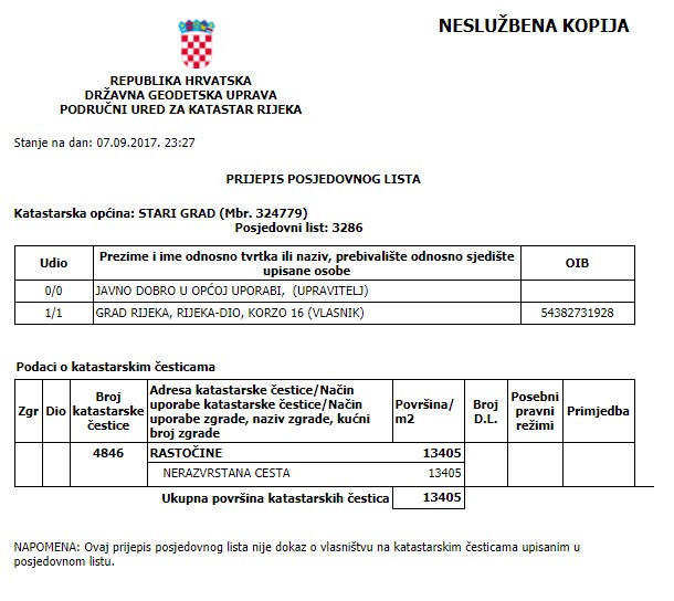 Uvidom u zemljišne knjige čestica na kojoj se nalazi 813/1 kao i okolne su u vlasništvu grada Rijeke a ovdje je Adria PA postavila veliki reklamni pano sa oznakom dućana kao i velike reklamne zastave koje jako škripe i od kojih okolni stanari ne mogu spavati od škripanja.
