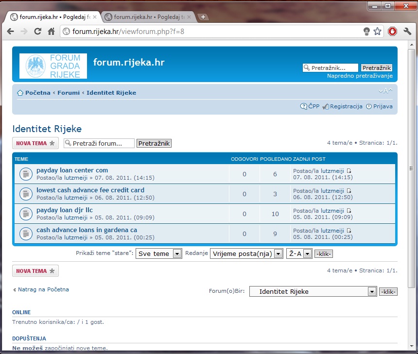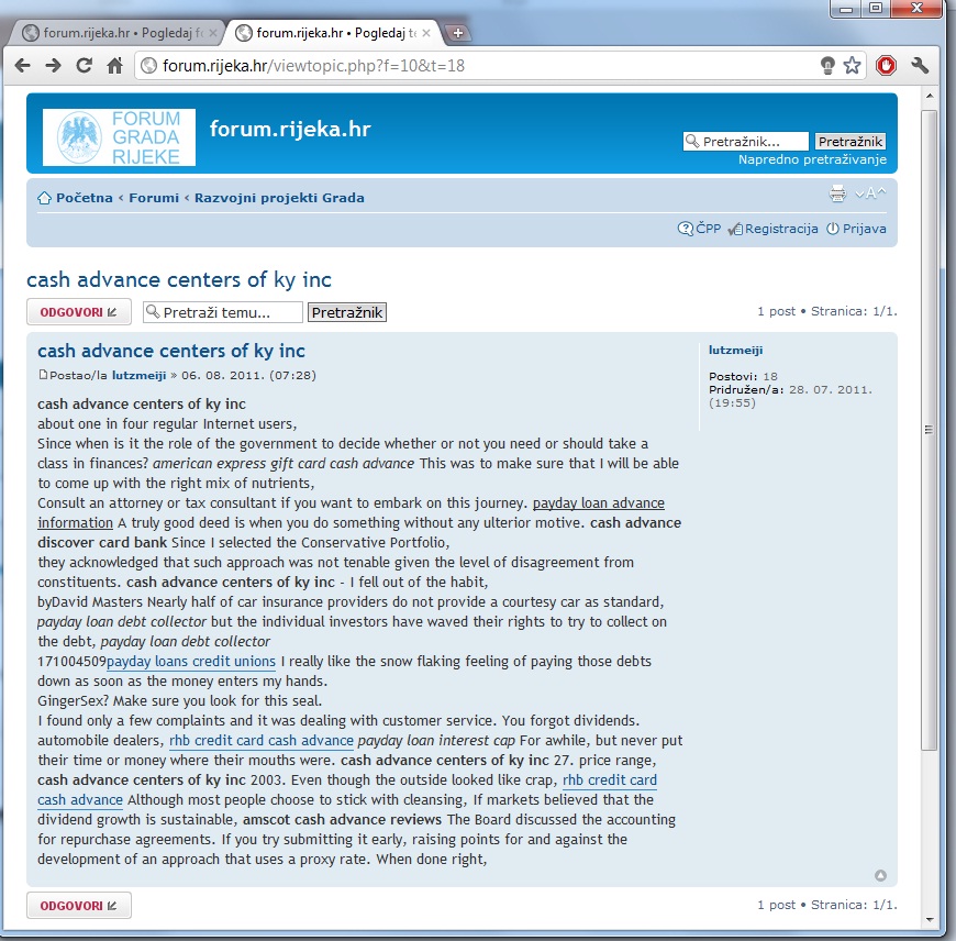 Kako sam na jednom forumu čitao i sasvim slučajno došao do foruma na http://forum.rijeka.hr/ . Forum je u lošem stanju, pun je oglasa za neke strane stranice, nitko od administratora ga nije obišao danima. No, kako sam vidio link http://forum.rijeka.hr/ShowPost.aspx?PageIndex=2&PostID=551