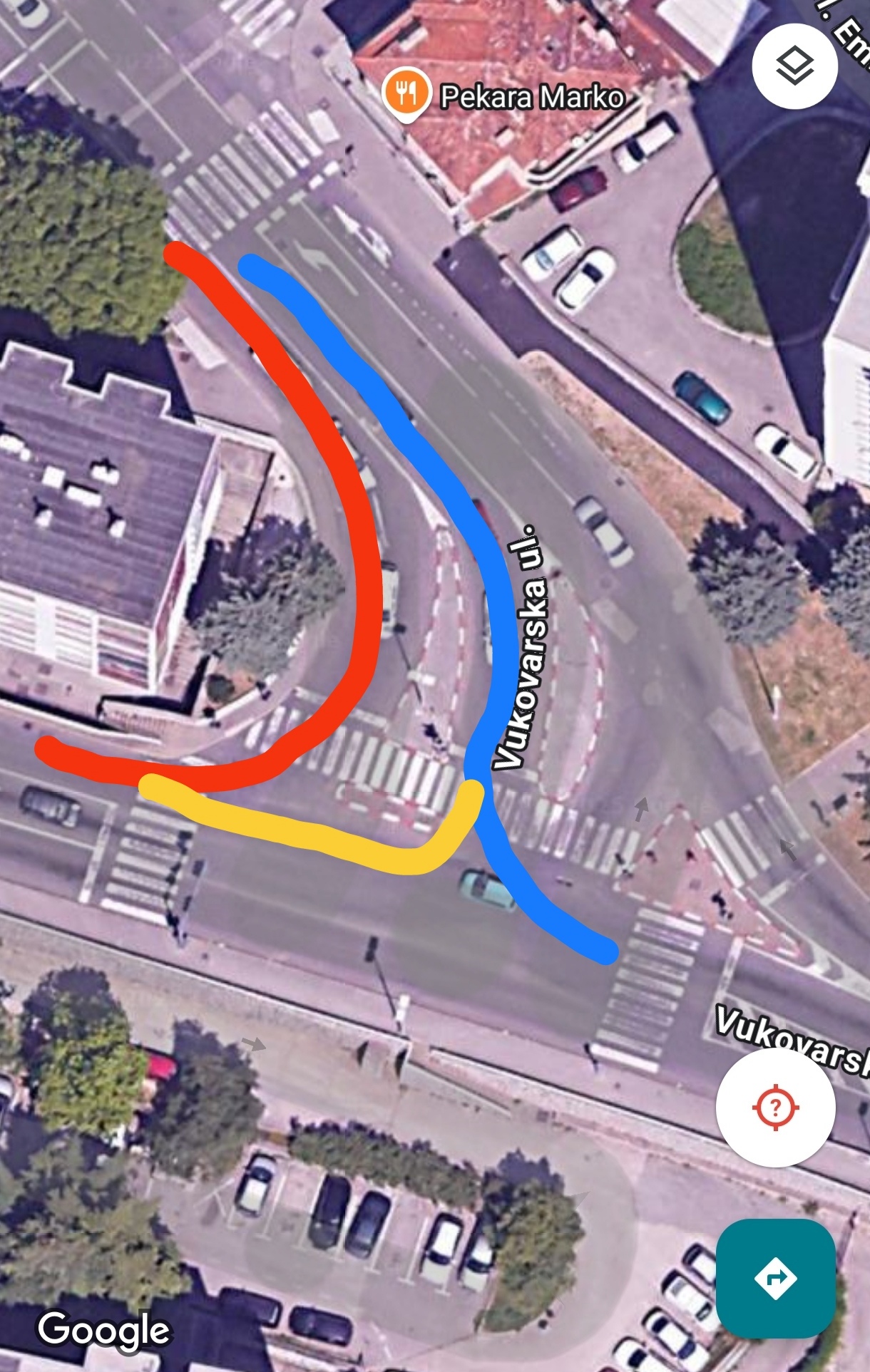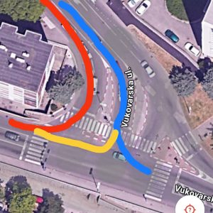 [Na slici crvena linija označava prijašni smjer kretanja vozila te sadašnju zatvorenu traku. Plava crta označava sadašnji smjer kretanja odnosno traku koja se koristi za skretanje istočno prema centru. Žuta crta označava smjer smjer kretanja vozila koja idu prema Rujevici i de jure čine opasane prekršaje prelaska na crveno te vožnja protiv horizontalne linije koja kaže da je to traka za lijevo]