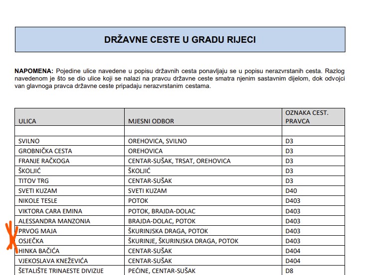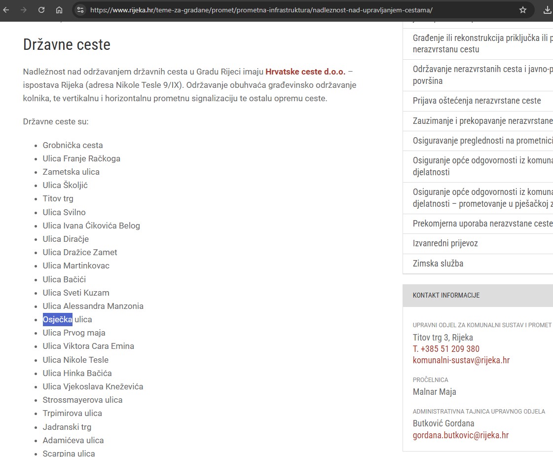 Iako je jasno navedeno u Odluci da Osječka ulica više nije državna cesta, na službenim web stranicama Grada Rijeke u prosincu 2024. još uvijek stoji da je Osječka ulica, zajedno s Ulicom Prvog maja, državna cesta. Čini se da navedeno ne znaju ni djelatnici Grada, Komunalnog sustava niti Rijeka Plusa. Unatoč svemu, upiti preko Gradskog oka i web portala Grada Rijeke, pa čak i telefonski Rijeka Plus odbijeni su s obrazloženjem da se obratimo Hrvatskim cestama, što je, kao što je poznato, pogrešno.