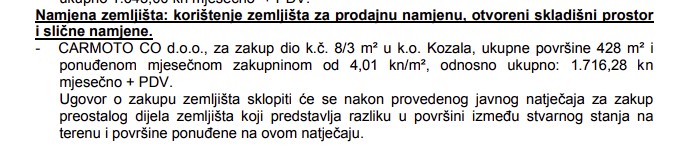 – CARMOTO CO d.o.o., za zakup dio k.č. 8/3 m² u k.o. Kozala, ukupne površine 428 m² i