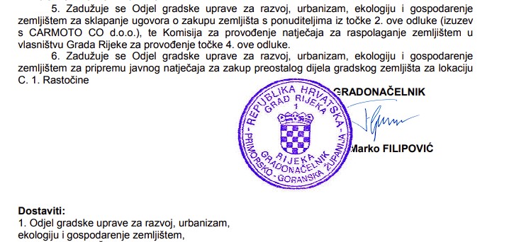 Nakon toga Grad Rijeka u 2021 godini, tj Gradonačelnik Marko Filipović, prema dokumentu u prilogu provodi javni “natječaj za korištenje zemljišta” na koji samo Carmoto ima pristup jer je njemu iza dvorišta napravljeno iza rampe koju zatvaraju, na koji se samo Carmoto javlja i dobiva ogromno zemljište za parking za samo 1716 kn mjesečno!?