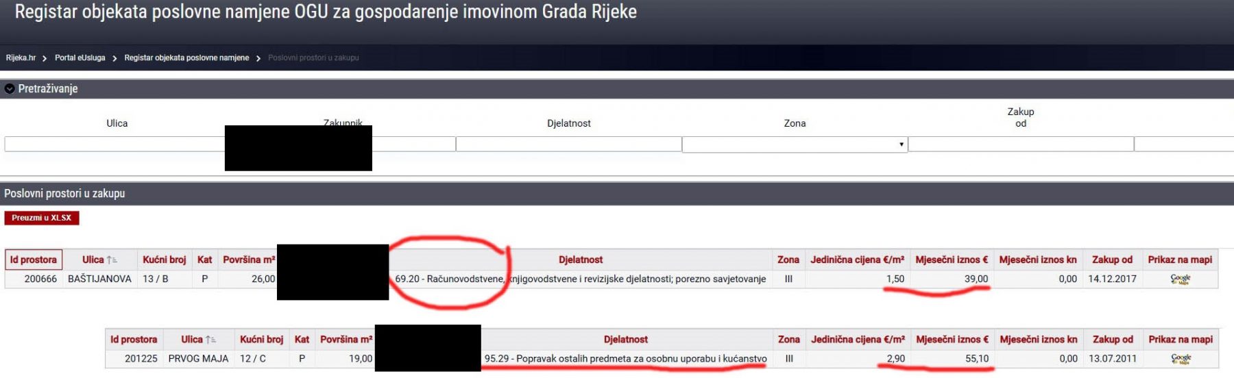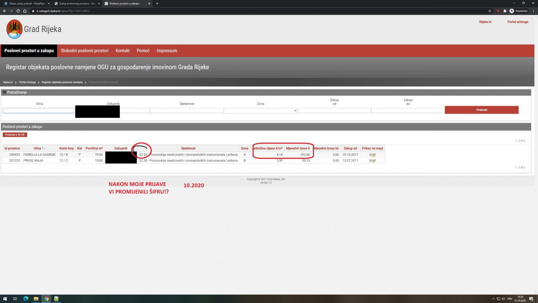 Također, zašto za prostor 201225, koji ima najam od 55 eura mjesečno, iako se reagiralo prije više od godinu dana, te zakupnik od 2017 (na službenim stranicama još od 2017. piše da ne rade u tom prostoru), nedavno sam slikao taj prostor, jer je bio otvoren dok se zgrada renovirala i bojala se vrata, unutra je samo luster i ogledalo na zidu, godinama je prazan a navodno se tek 2020. javio da ima neko curenje, iako ja curenje nisam vidio.
