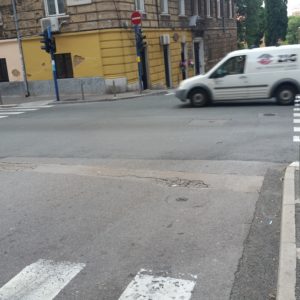 Poštovani, u Ulici Slaviše Vajnera Čiče i njegovom raskrižju s Ulicom Pomerio nalaze se sad već opasna udubljenja, toliko da kotači propadaju i onemogućuju normalnu vožnju, pogotovo prilikom skretanja, vozilo može poskočiti i nekontrolirano skrenuti na vrlo frekventnom raskrižju, gdje je blizu i škola.