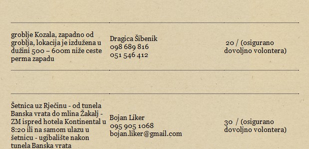 … te lijepo molimo da se briše informacija da se čisti prostor oko groblja Kozala, zapadno od groblja. … taj prostor je granica triju MO (Škurinjska draga, Kozala i Brašćine Pulac) i što smo već dogovorile niže navedene akcije sa školom i vrtićem .