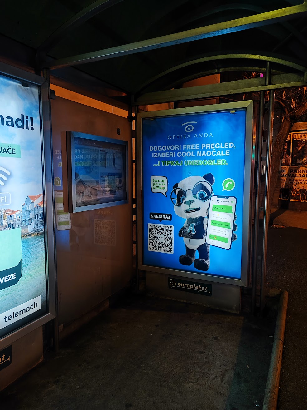Ali više od pola reklame ne svijetli, moja žena je početkom godine kontaktirala Europlakat da poprave žarulje u reklami, prošlo je 9 mjeseci i još uvijek je čekaonica u mraku.