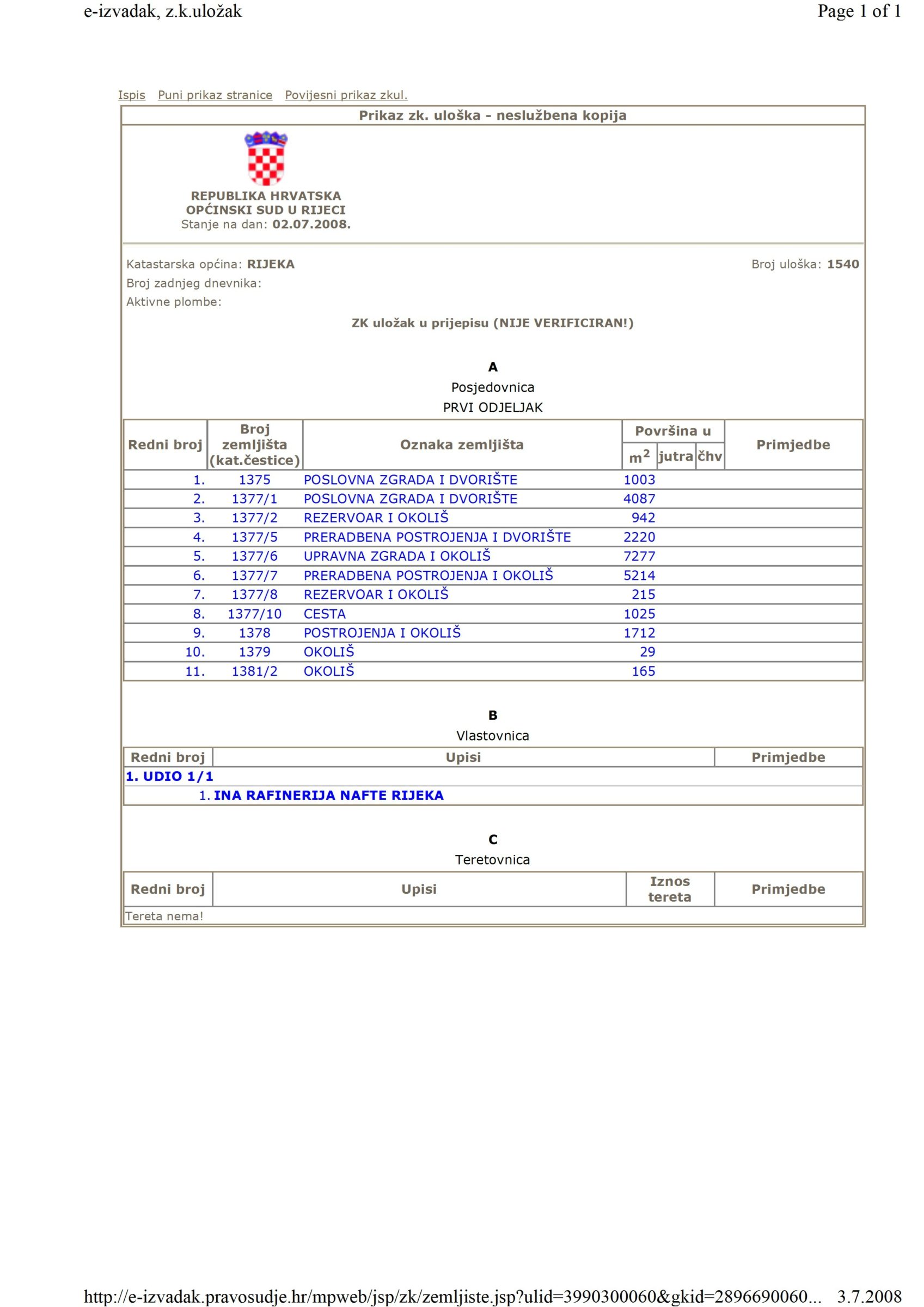 2. I još nešto, kako je moguće da ispred ININE zgrade (na broju 26 na potezu od stražarske ININE kućice do stare zgrade ININA Transporta, broja 36, uz same ININE zgrade i pogon, na ININOM parkiralištu (kojega je INA izgradila) je RIJEKA PROMET također prefarbao ININ parking, postavio svoje naplatne aparate i na taj način bespravno sebi uzeo u pravo naplatu parkiranja na tuđem (ININOM) zemljištu, kada je to isključivo ININO vlasništvo i jedino bi tu INA mogla naplaćivati parking (u privitku prilažem vlasnički list INE na toj adresi, gdje je vidljivo da je parking uknjižen na INU, a katastarski, nadležni također mogu provjeriti!!). Bilo bi zanimljivo da se netko od nadležnih u INI sjeti pa tuži RIJEKA PROMET za nezakonito uzurpiranje posjeda, te retroaktivno naplati najam RIJEKA PROMETU. Dakle možemo zaključiti da se RIJEKA PROMET bogati na nezakonit način. Grad svakako ne bi smio dozvoliti uzurpiranje privatnog posjeda!