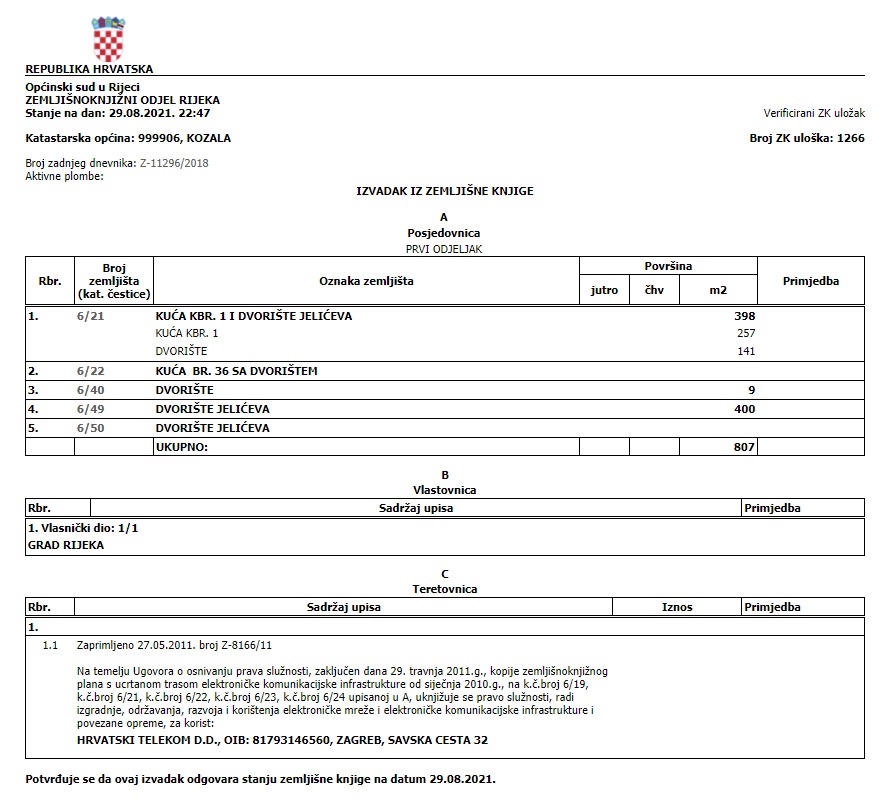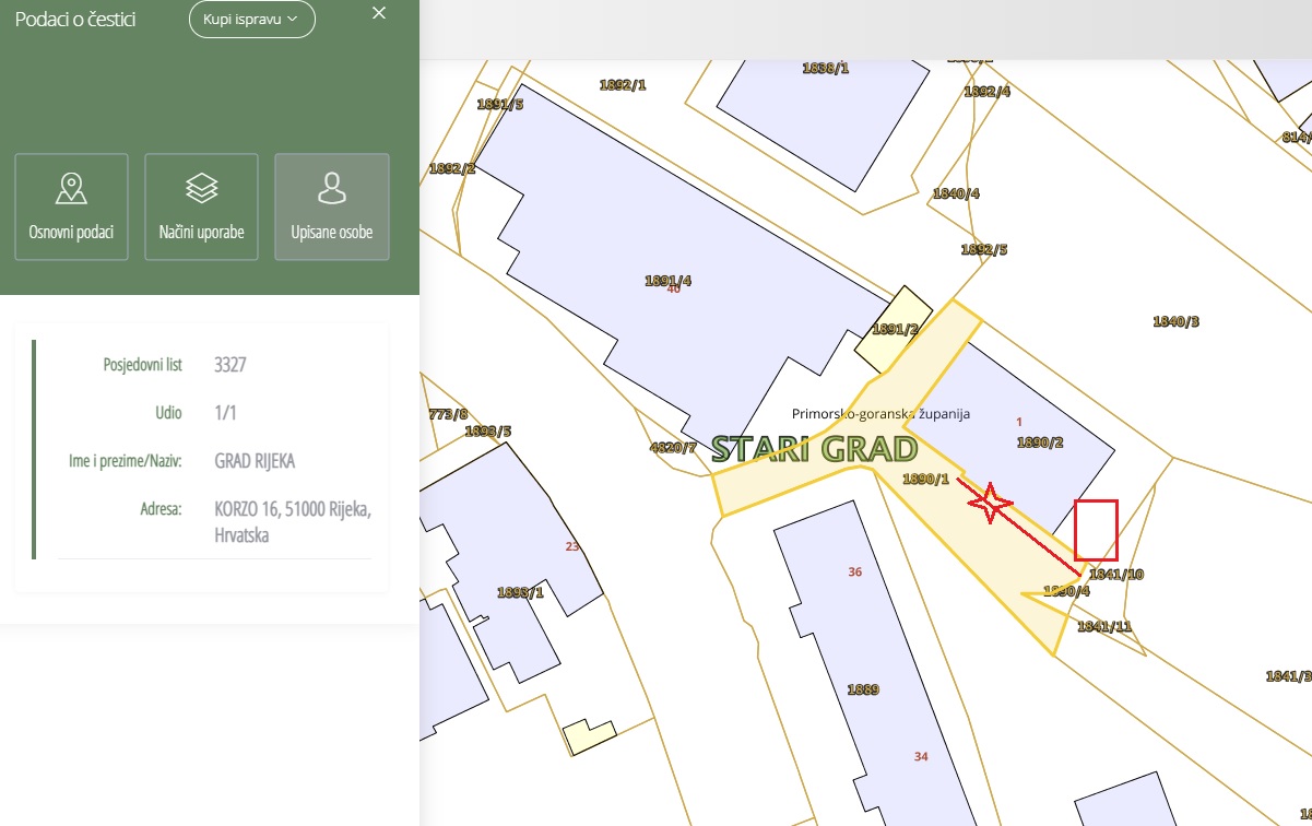 Na zemljišnim knjigama je naveden prostor oko zgrade i prometnica kao vlasništvo Grada Rijeke, nije riječ o privatnoj okućnici pa molim da komunalno redarstvo naloži uklanjanje navedene fotelje.