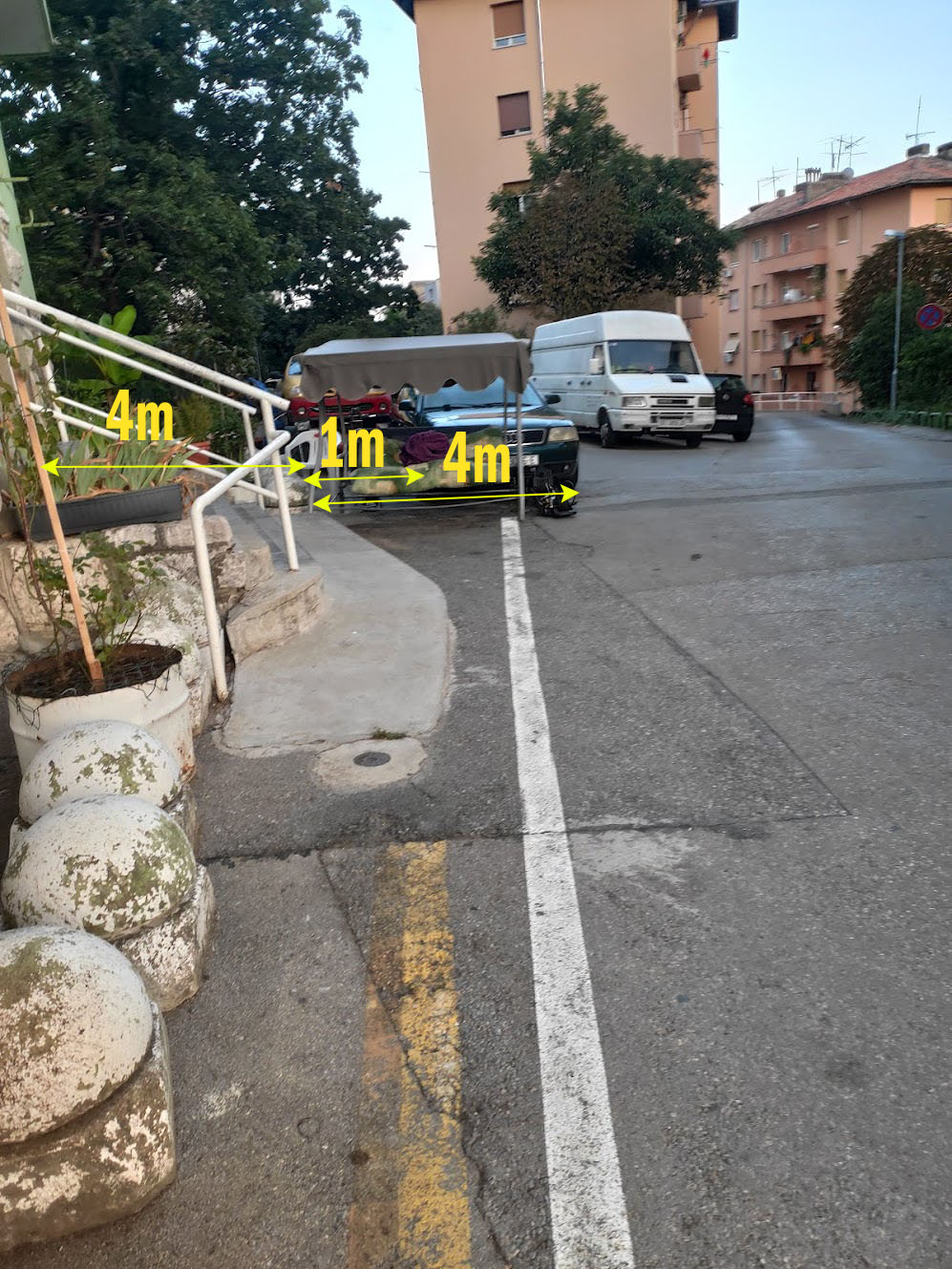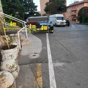 Kada su se označavala bijelom bojom parkirališna mjesta u okolici, dobio sam informaciju od Rijeka prometa da nije moguće tamo označiti parkrina mjesta zbog nedovoljne širine ispred (kao i u ostatku ulice) ali je ispred te zgrade netko (je li na svoju ruku) označio “njihova” parkirna mjesta kao i postavio betonske čunjeve oko zgrade.
