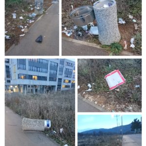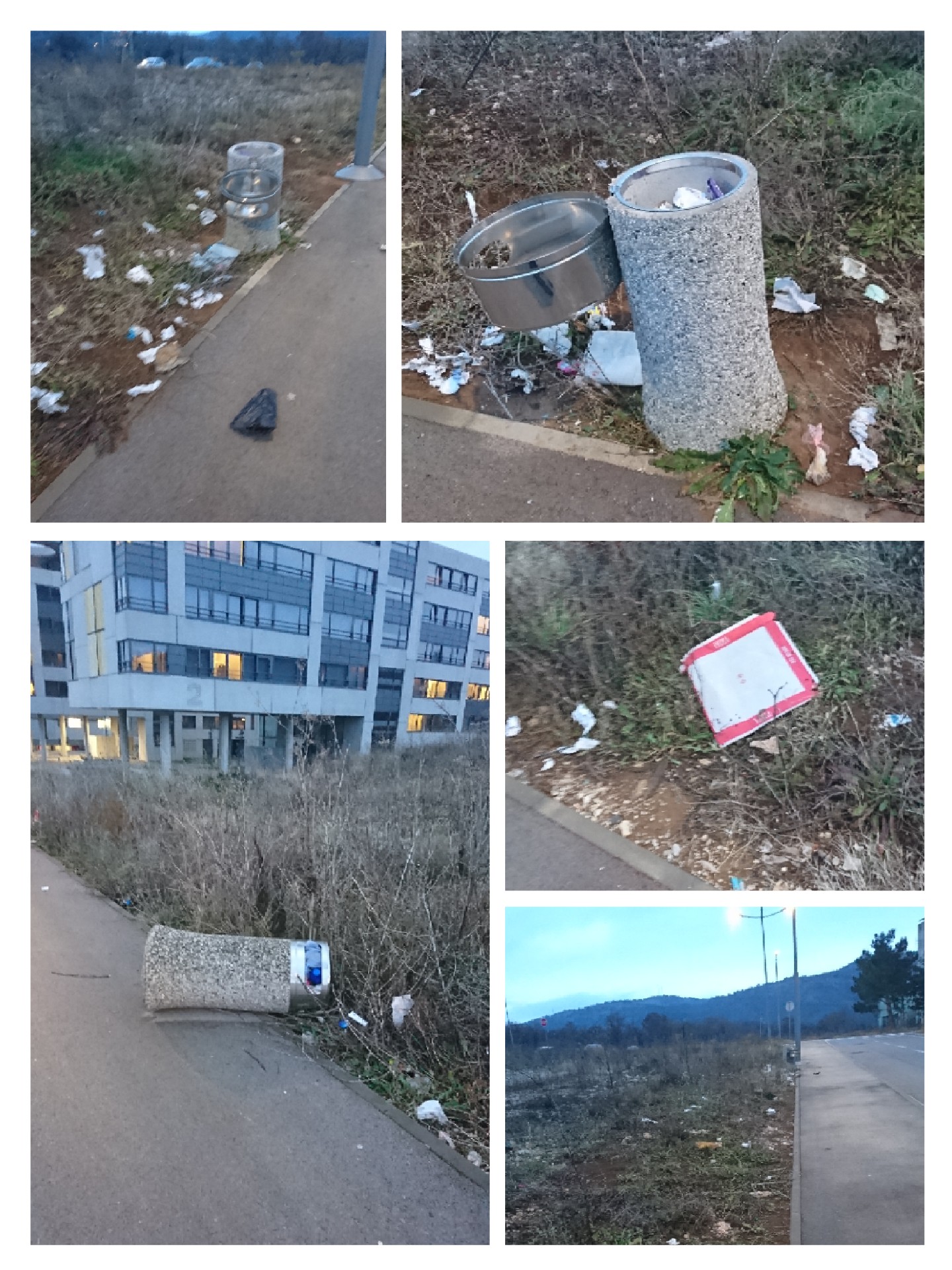 Ne znam tko je točno nadležan, nije ni bitno zapravo. Na pločniku uz dio prometnice koja ide okomito između studentskog centra i restorana, gdje je parkiralište, postavljene su kante za smeće koje mjesecima nitko ne prazni. Došlo je do toga da su pretrpane, i sada je to sve iz raznih razloga razasuto uokolo. Također jedna je od nedavno i prevrnuta što je dodatno pridonijelo raznošenju otpada uokolo. U svakom slučaju ruglo.