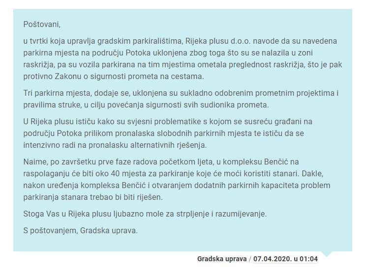 Poštovani 07.04.2020 u odgovoru na moj upit naveli ste da će parkiralište kod Rikard Benčića sadašnje Dječje kuće biti dostupno i stanarima, dok stvarna situacija nije takva. Stanari nemaju pravo parkiranja s povlaštenim kartama, iako je bilo planirano da se stanovnicima Potoka omogući parkiranje na istom s obzirom da je izgubljeno mnogo parkirnih mjesta na Rikard Benčiću. Naravno opet je netko vidio samo dobit i zaradu na štetu stanovnika Potoka. Dakle od 2020 jedini odgovori od Rijeka Plusa su “Molimo za strpljenje” , “Radimo na tome” , “Svjesni smo problema”. Plaća ide ali riješenja NEMA. Dakle jako profesionalni odgovori već dvije godine. U te dvije godine Grad Rijeka i Rijeka Plus nisu ništa napravili da bi se poboljšala situacija s parkingom, naprotiv uklonjena su dodatna parkirna mjesta te je zabranjeno parkiranje stanarima s povlaštenim kartama na Rikard Benčiću kako bi se “olakšalo” stanovnicima Potoka, iako je trebalo biti omogućeno stanarima. Naravno sve za dobit i profit Rijeka Plusa kako bi zarađivali na tome dok stanari mogu jedino MOLITI i pisati ovakva upite već 2 godine ali nažalost zainteresiranost Grada i Rijeka plusa dok novac kapa je nikakva. Zanima me slijedeće