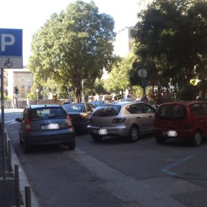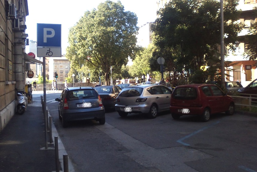 Sada prostor nije više zauzet stolovima kafića nego je otvoren za parking ali bez označenih plavih linija. Tu se nalazi i znak da je taj dio rezerviran za osobe s invaliditetom.