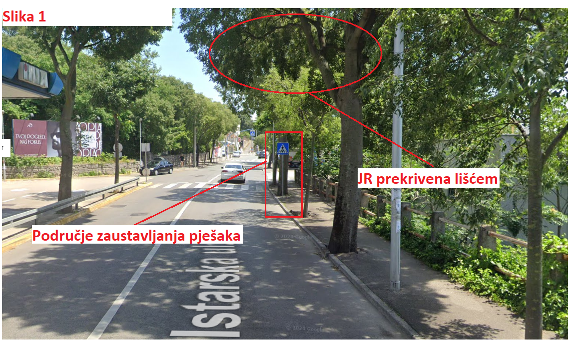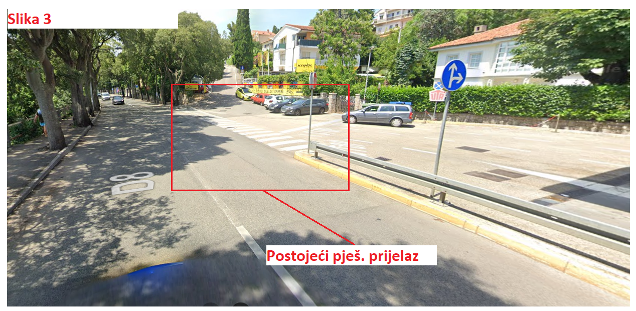Također, ono što ovdje predstavlja najveću opasnost jest nepreglednost pješačkog prijelaza u smjeru zapad-istok (smjer Rijeka) zbog postojećeg drvoreda sa južne strane kolnika. Nakom provedenih mjerenja, pješak koji stoji sa južne strane kolnika i pokušava preći preko pješačkog prijelaza u smjeru BP vidljiv je tek na udaljenosti od 23 metra, a pri brzini od 50 km/h osobnom vozilu u uvjetima suhog kolnika potrebno je 15 m za sigurno kočenje te 24-26 m za kočenje u uvjetima mokrog kolnika. Naglasak se stavlja na činjenicu da se na spomenutoj dionici ne vozi brzinom od 50 km/h, tako da je put kočenja znatno veći (računica ne uzima i vrijeme reagiranja vozača, stanje vozila itd.). U prilog idu i činjenice da se pješak dok stoji na pješačkom prijelazu nalazi u mraku (nepostojeća/nedovoljno jaka javna rasvjeta na južnoj strani kolnika) te da je u većini slučajeva kolnik mokar i sklizak, poesebice tijekom jesni i zime kada noć nastupa puno ranije pa je i vidljivost znatno otežana.