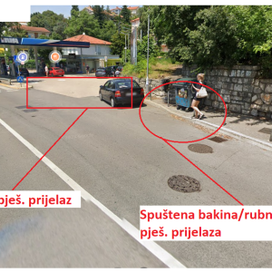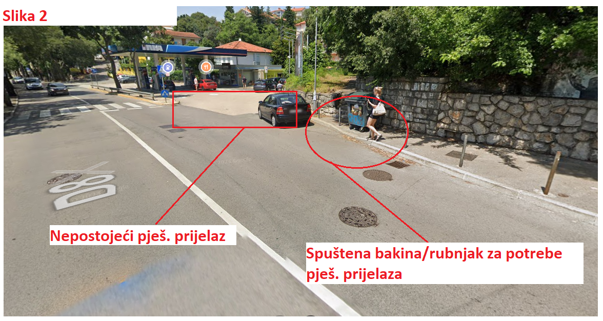 Nadalje, molim da se iscrta pješački prijelaz između nogostupa sa sjeverne strane kolnika i benzinske postaje INA (Slika 2), s obzirom da je prelazak nemoguć a postojeća infrastruktura je očigledno predvidjela pješački prijelaz na toj lokaciji. Napominjem da pješački prijelaz postoji sa druge strane BP.
