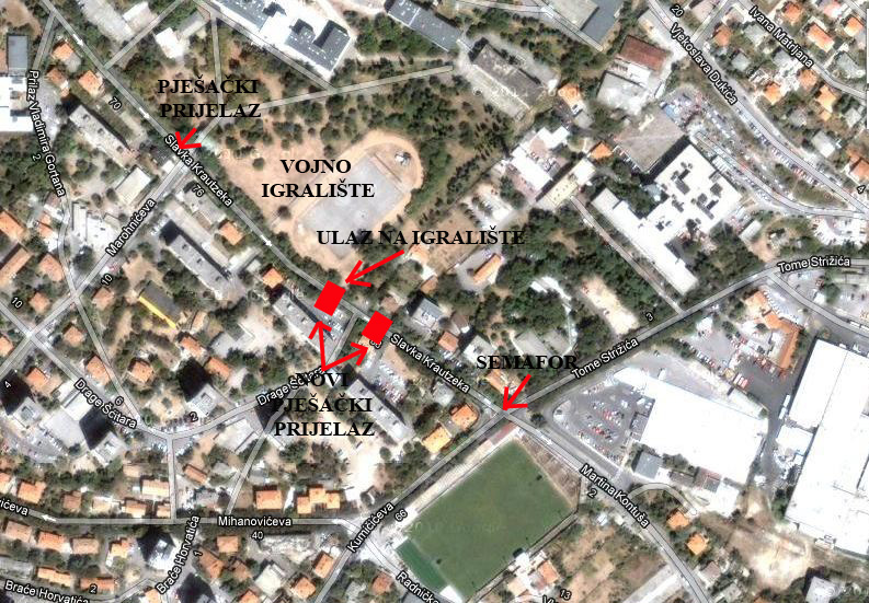 Prijedlog za iscrtavanjem dodatnog pješačkog prijelaza kod bivše vojarne Trsat smatramo opravdanim budući da pješaci zaista na mjestu igrališta prelaze ulicu na neoznačenom mjestu. Prijedlog će se detaljnije analizirati kroz prometno rješenje za ulicu Slavka Krautzeka koje je upravo izradi i ukoliko se pribave potrebne suglasnosti izvest će se u kratkom roku.