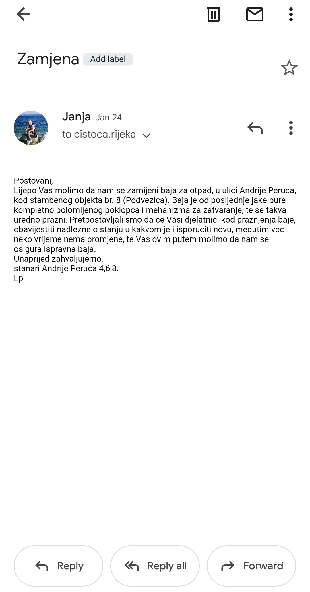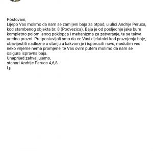 prije 3 tjedna smo poslali mail Cistoci s molbom da nam se zamijeni baja koja je vec neko vrijeme razbijena (slika maila u prilogu). Nazalost, nitko se nije udostojio niti odgovoriti, a kamoli zamijeniti baju, pa da pokusamo preko vas, dakle, ulica je Andrije Peruca (Podvezica), a baja je za stambene objekte 4,6 i 8.