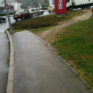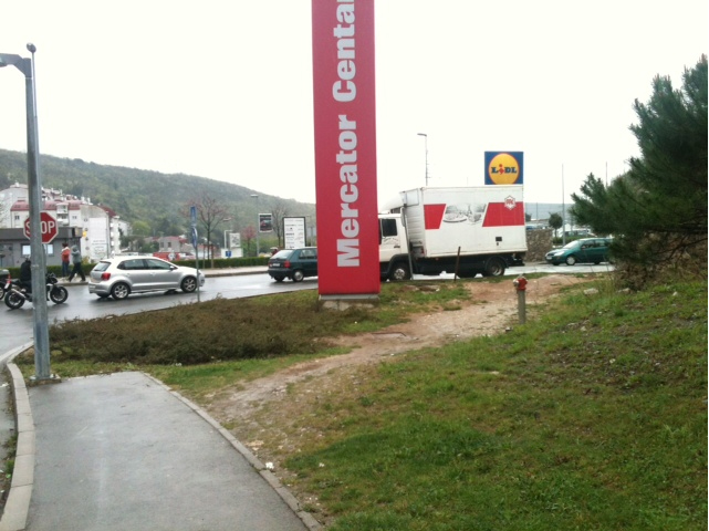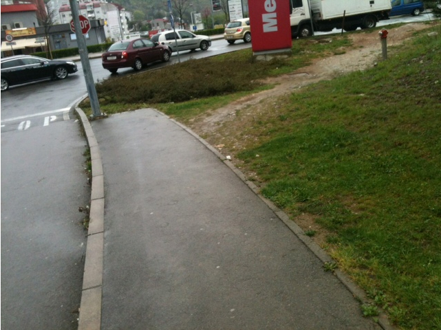 Ipak nece …. nista od trotoara znaci …. sada znamo da moramo obilazit ovu blatnjavo zelenu povrsinu jer bi nam Mercator mogao ispostaviti tuzbu za devastaciju zelenog pojasa