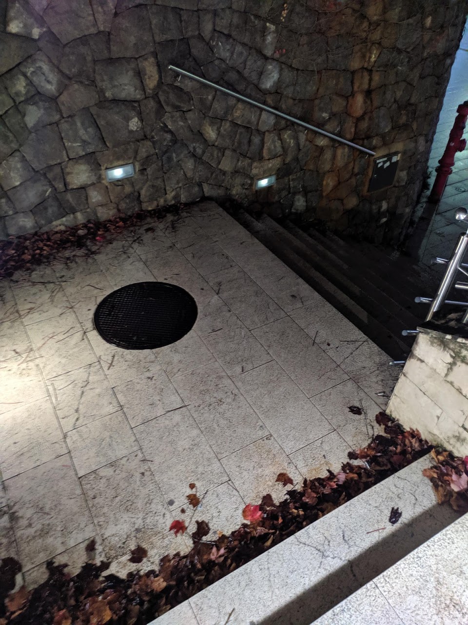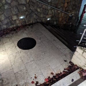 Stakla podne rasvjete oko bazena su već smeđa, a stepenice iznad pizerrije su u mraku jer ne rade mali reflektori.