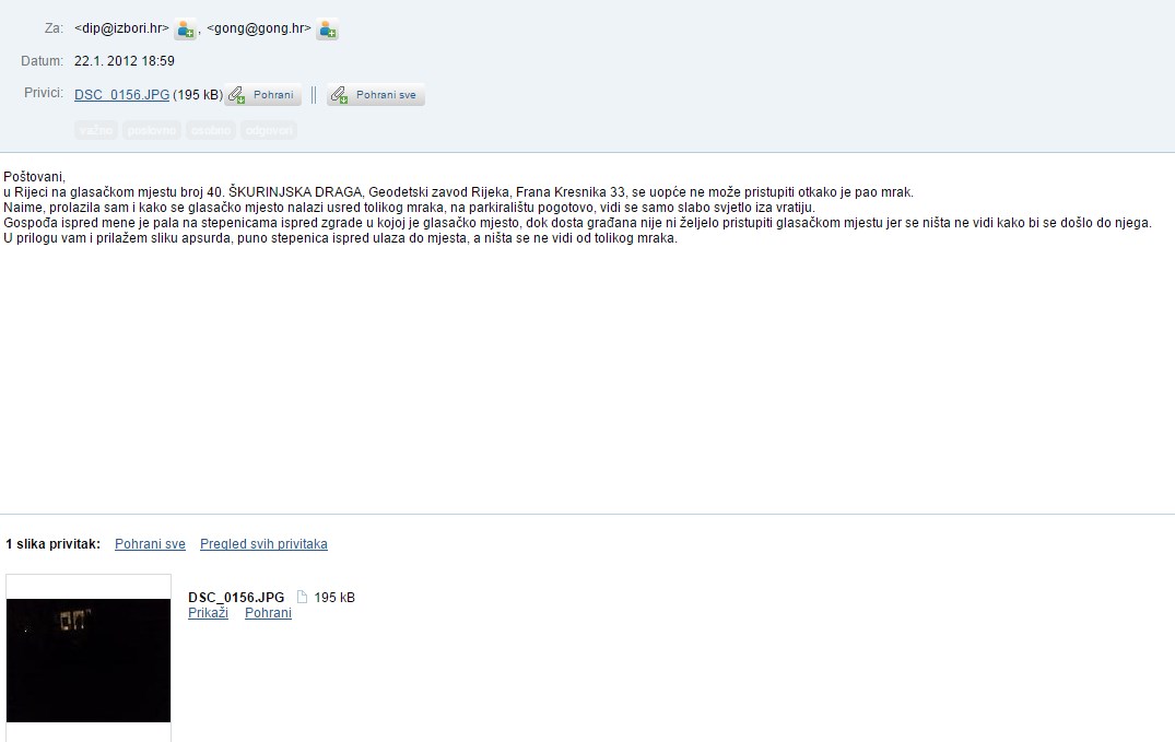 Još 2012. sam obavijestila DIP, Gong i Energo kada je u totalnom mraku bio navedeni parking i promijenili su svega 1 viseću žarulju, onu ispred zgrade gdje su izbori.