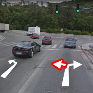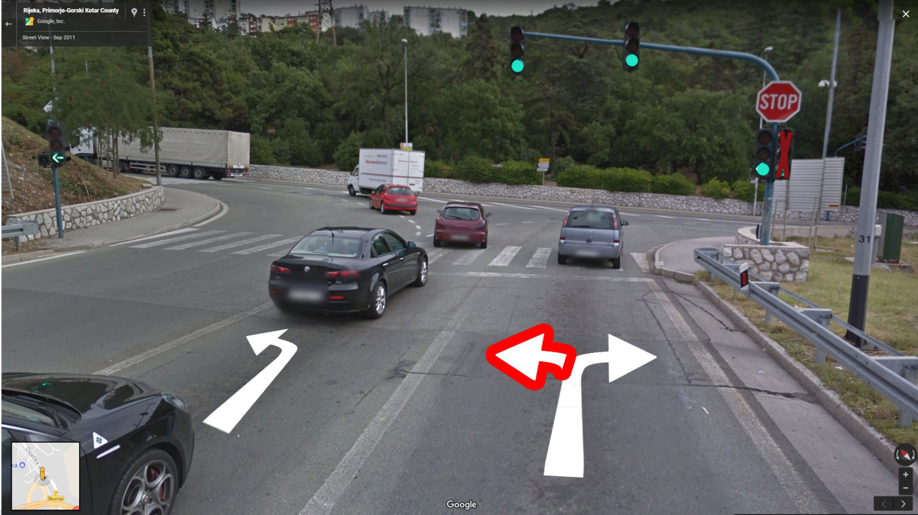 Vjerujem da mnogi vozači znaju kakva se kolona redovito stvara u vrijeme gušćeg prometa na izlasku sa zaobilaznice – čvor Škurinje. Prvestveno se to odnosi na uključenje vozila u Osječku ulicu u smjeru sjevera prema rotoru. Određen dio vozača koristi desnu prometnu traku (vidi sliku) za obilazak kolone i lijevo skretanje čime krše (trenutni) prometni režim. Zanima me zašto se ne dozvoli opisano skretanje kako bi se rasteretila gužva koja nastaje? Osječka ulica u smjeru sjevera ima dvije prometne trake te bi se uz minimalne zahvate na horizontalnoj i vertikalnoj signalizaciji moglo omogućiti korištenje obje izlazne trake sa čvora Škurinje za lijevo skretanje bez da se pritom ugrožava ostale prometne pravce. Tko god provede 5-6 izmjena na semaforu čekajući na uključenje, znat će na što mislim.