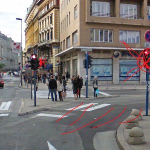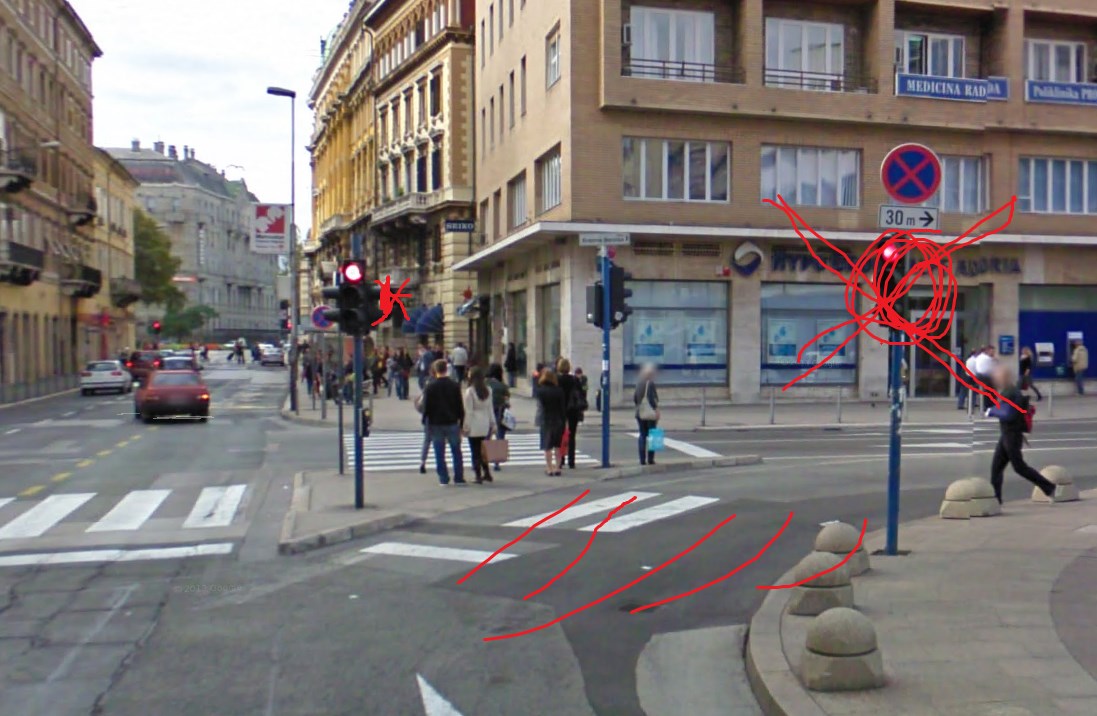 Na istom semaforu mi je i nelogično što postoji semafor za onaj mali prijelaz između otoka i Jadranskog trga.