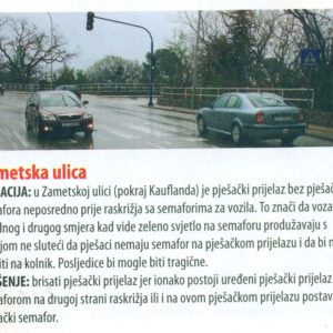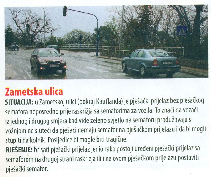 Interesantno je da se u najnovijem broju časopisa HAK-a isto to raskršće smatra opasnim za pješake i predlaže se brisanje spornog prijelaza bez semaforske regulacije, zbog mogućih tragičnih posljedica.