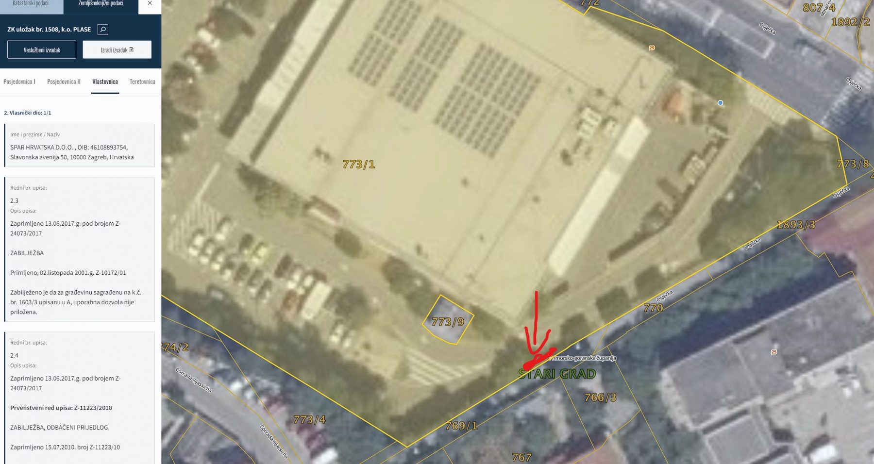 U zemljišnim knjigama Spar Hrvatska je vlasnik (prije Billa Hrvatska) zida gdje su stepenice i prije je Billa održavala tu ogradu, na jednom dijelu je i promijenjena ali ni tamo nije u najboljem stanju.