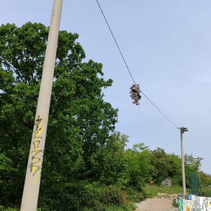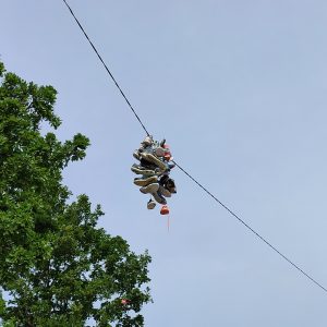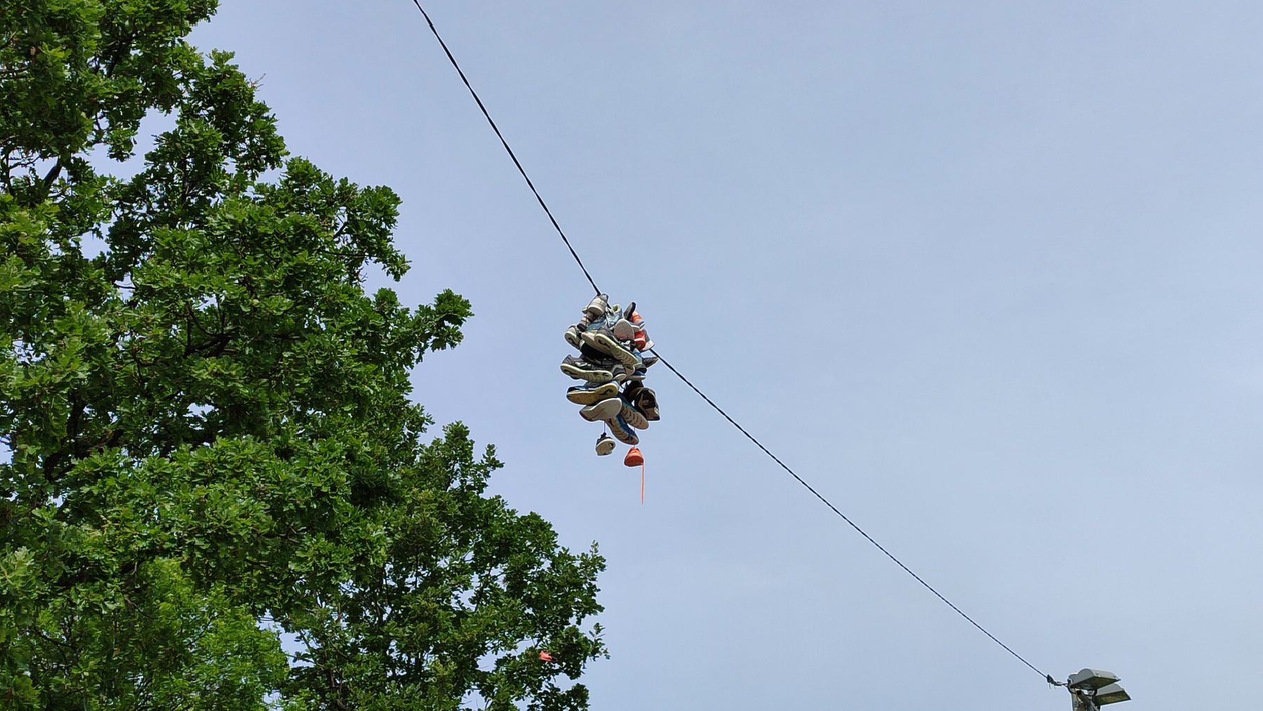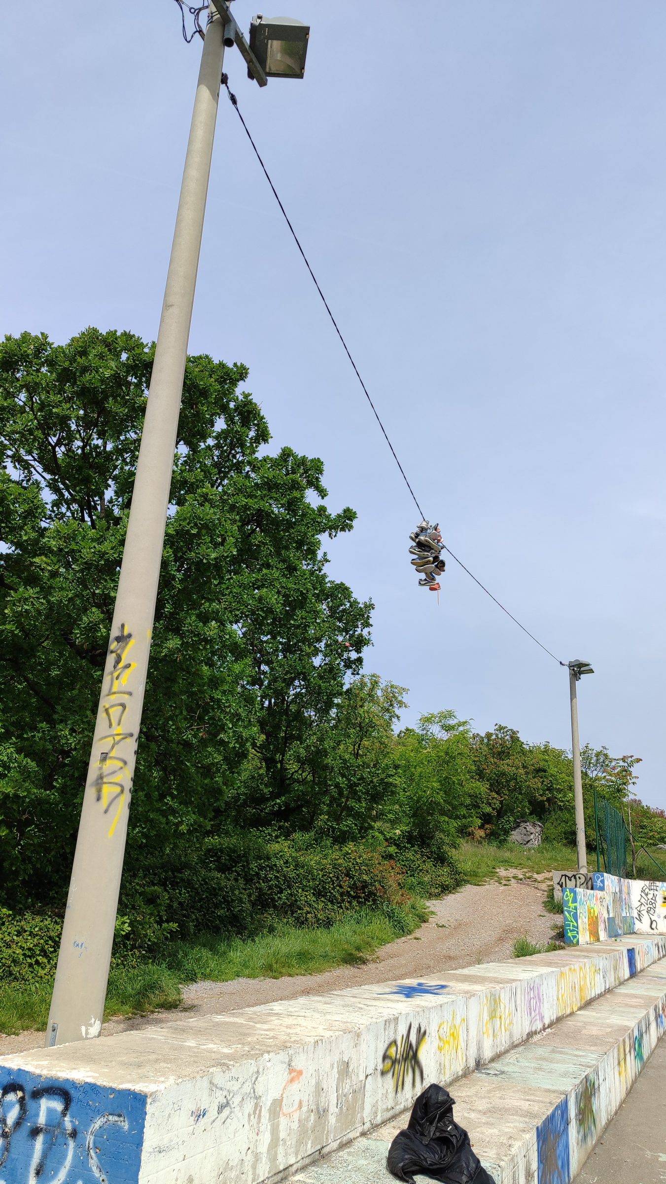 Pošto je to izazov, mladima … Da prebace tenisice preko kabela, u ovom slučaju napaja reflektore kod malog igrališa…
