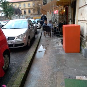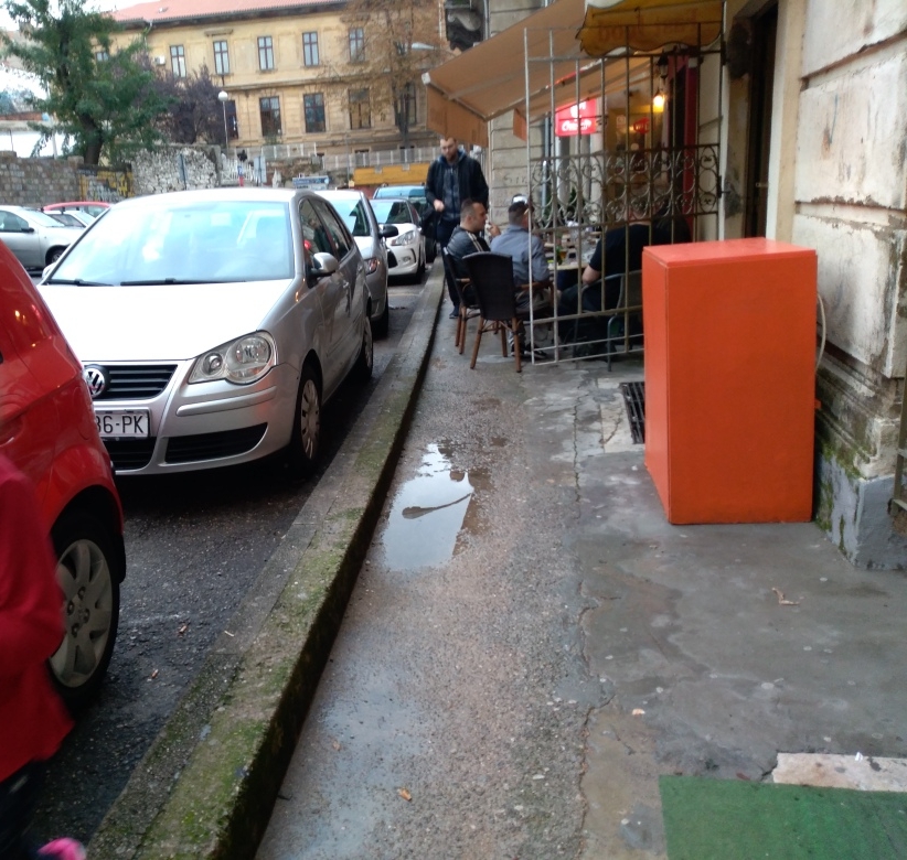 ponovno Vam se obraćam sa pritužbom na terasu kafića Red hot koja u Filipovićevoj ulici bezobrazno priječi ljudima prolaz. Dakle, komunalni redar je (slučajno ili namjerno) snimio terasu kafića izvan radnog vremena, kada su stolovi i stolice zbijeni i pospremljeni uza zid. Iako niti tada širina prolaza za pješake ne iznosi minimalnih 160 cm, uz terasu kafića može se proći. U prilogu Vam šaljem kako terasa kafića izgleda u radno vrijeme, a Vi mi dajte upute kako da ovuda prođem. Molim Vas, nemojte nas praviti blesavima jer se dovoljno blesavo osjećamo dok se veremo po ovom zidiću da bi prošli ulicom. Da li je to komunalni redar po prvi puta u životu bio u Filipovićevoj ulici ili je ovaj problem vidio i prije, ali ga jednostavno nije briga?