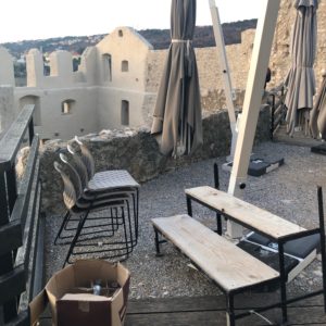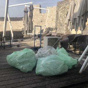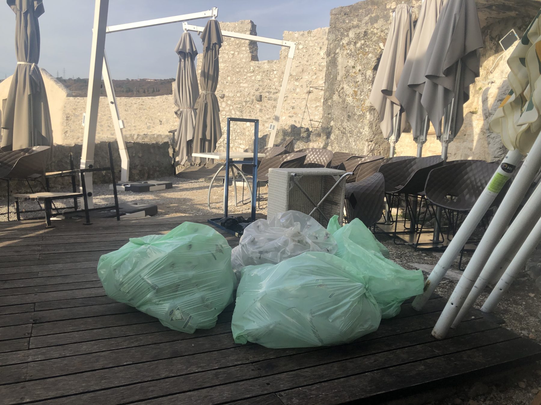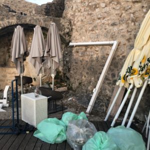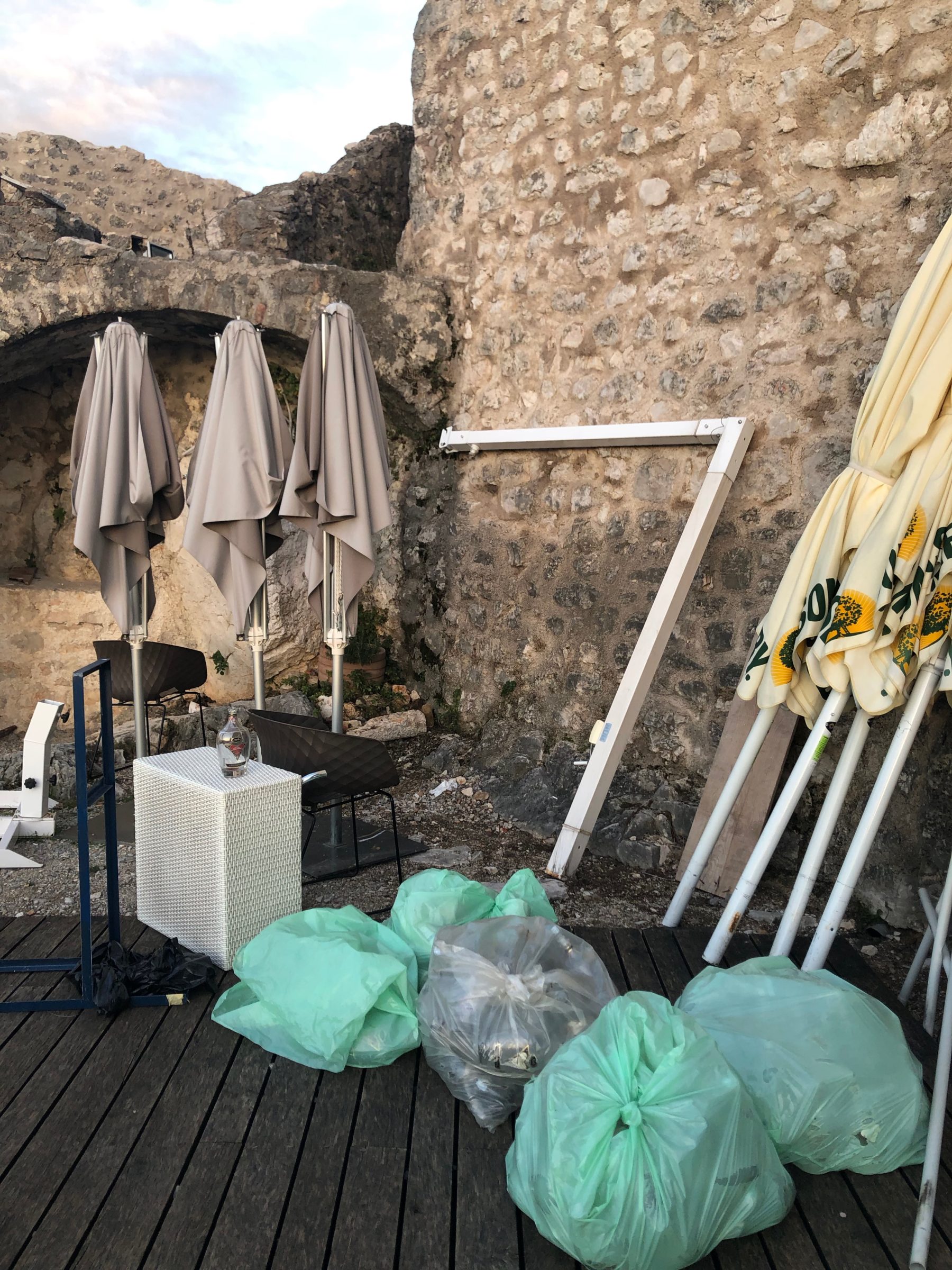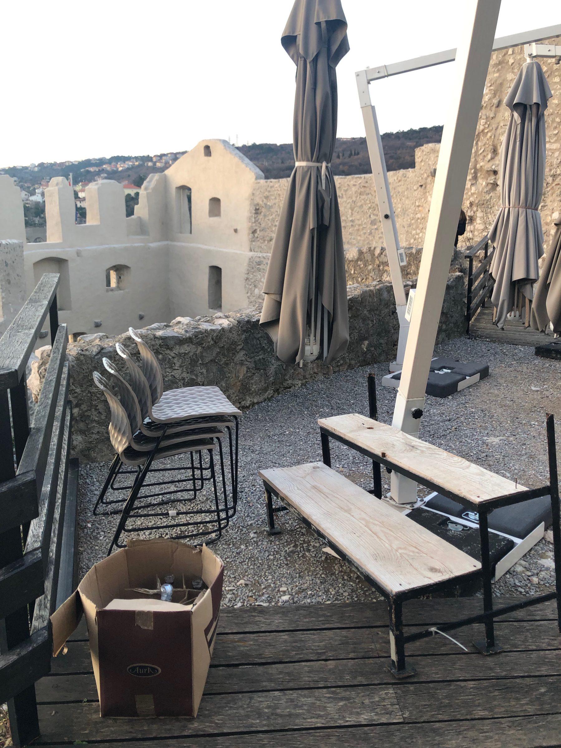 S obzirom da se radi o javnom prostoru, ali i o zaštićenom kulturnom dobru, mislim da je neprimjereno da se suncobrani, stolice, stolovi, ali i druga oprema koja nije u funkciji, a vlasništvo je, pretpostavljam, kafića koji se nalazi na gradini, odlaže i skladišti na mjestu kako se vidi na slikama u prilogu.