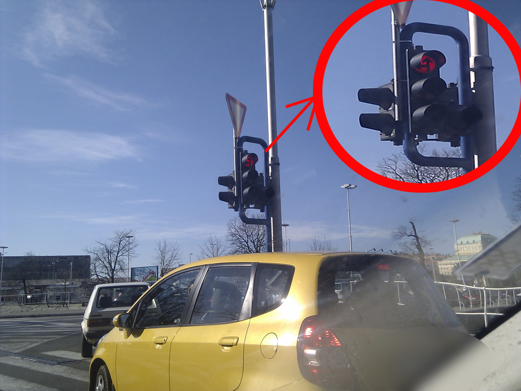 Semafor jasno kaze da je crveno za smjer ravno i lijevo. Neka promene semafore onda