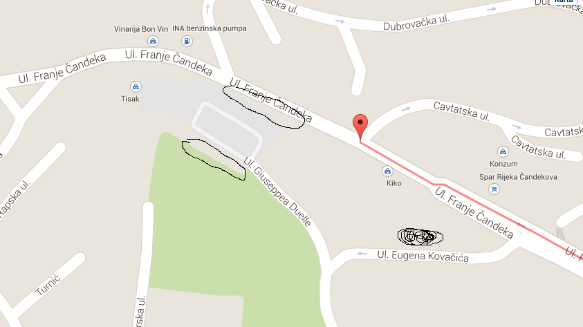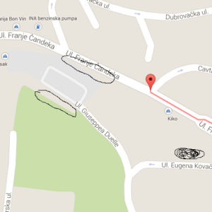 Kao i što bi trebalo pokositi travu uz glavnu prometnicu u čandekovoj Ulici uz to javno parkiralište. Na karti sam označio lokacije gdje je smeće, i gdje treba kositi travu. Prazna dva kruga je trava koja obrasla uz parkiralište i gdje se nalazi razno smeće, a crni krug je lokacija mini depnija s kaučevima i ostalim smećem.