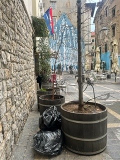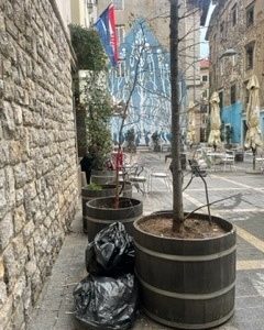 već tjednima dvije polupune vreće za smeće stoje u jednom kutu iza bačvi za cvijeće na trgu Matije Vlačića Flaciusa. Što je unutra, ne zna se.