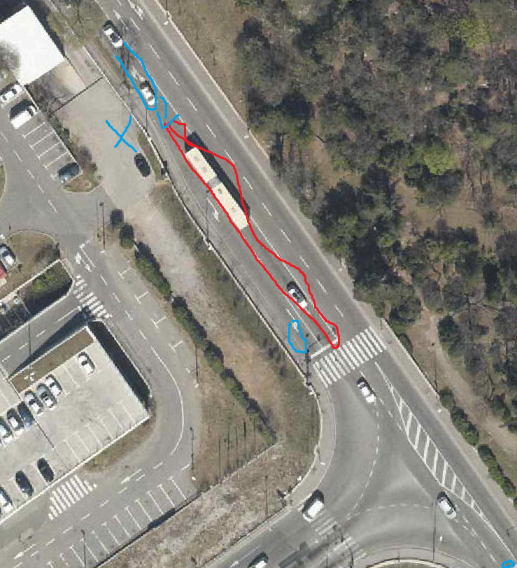 Vaš odgovor da se mora upaliti crveno na stražnjem semaforu radi vozila iz smjera Drenove koja su skrenula desno nije opravdan jer su ionako blokirana u Osječkoj prema 1. slici plavom bojom crvenim vozilima koji idu ravno.