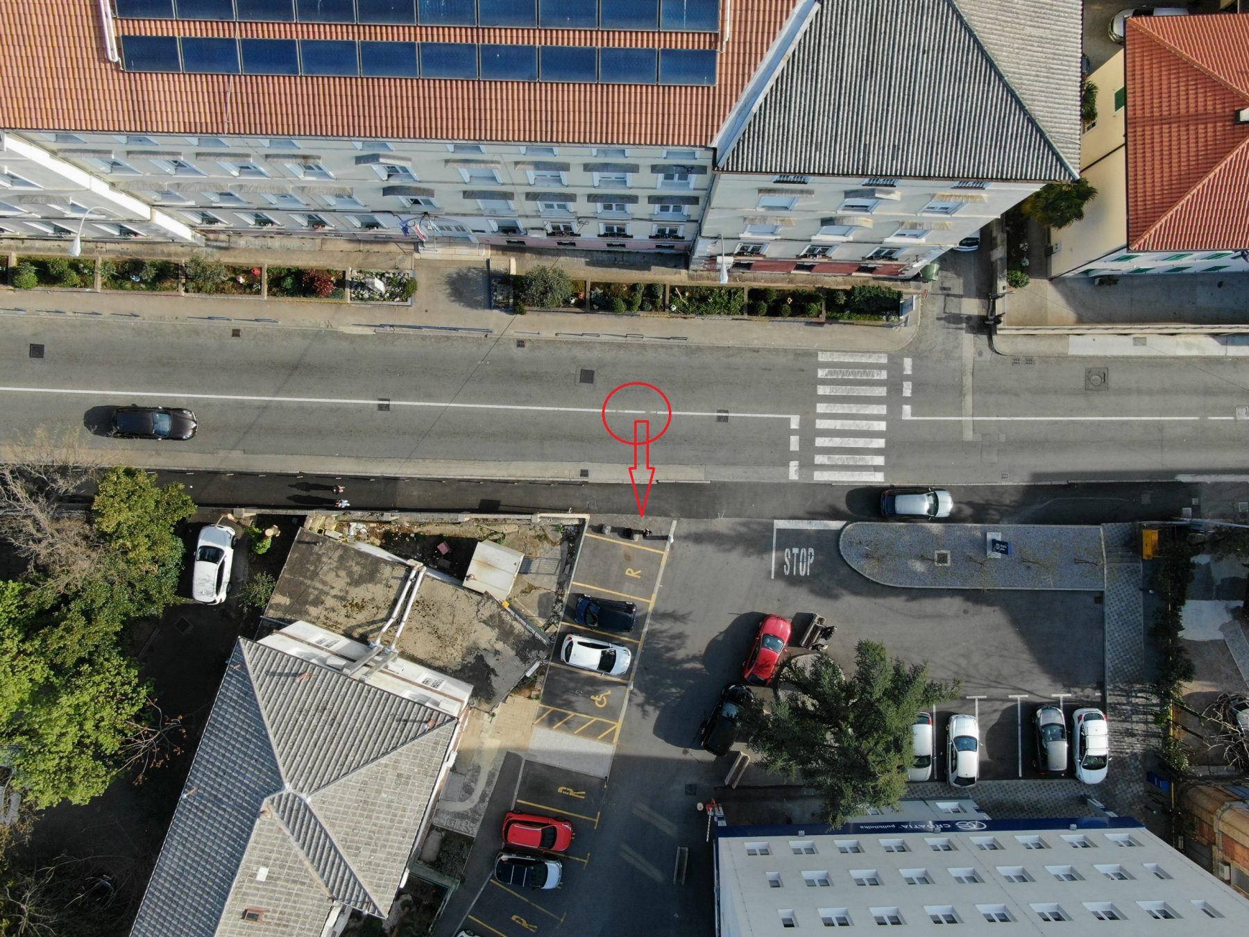 Bilo bi razumno da se na bivšem mjestu pješačkog prijelaza obilježi isprekidana umjesto pune razdjelne crte. Tvrdnja da „na ovoj lokaciji nikada nije bila obilježena isprekidana razdjelna crta“ nije točna, što je vidljivo na obje priložene fotografije – isprekidana razdjelna crta omogućavala je ulaz/izlaz u dvorište iz oba smjera i postojala je upravo na mjestu na koje je u listopadu 2022. premješten pješački prijelaz.