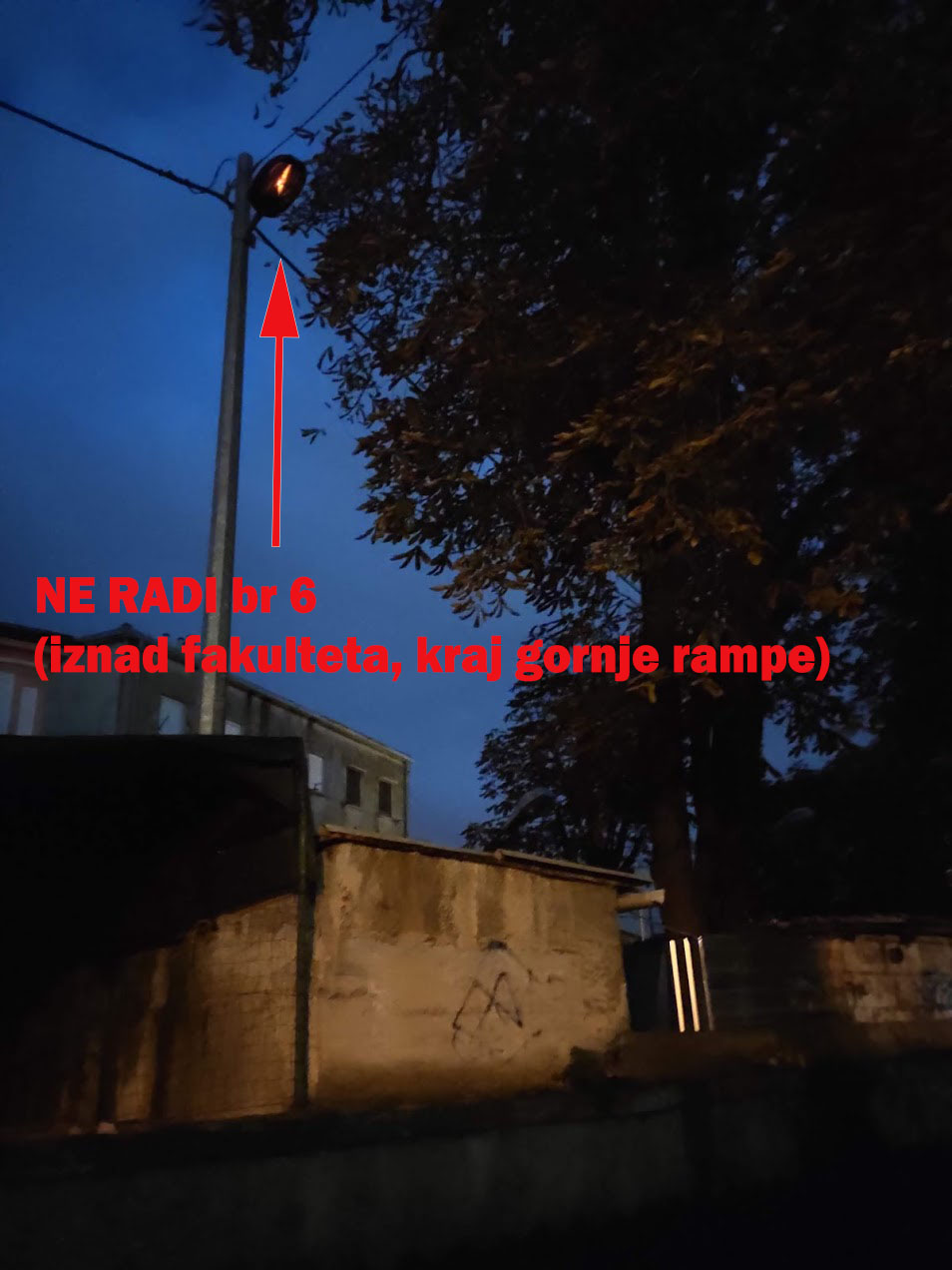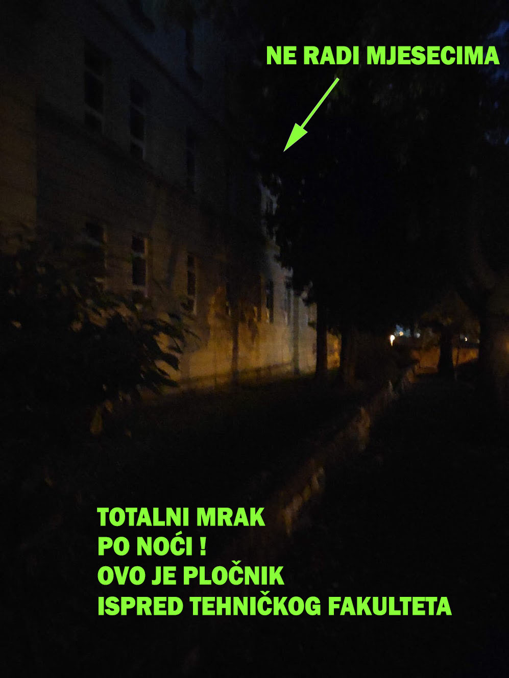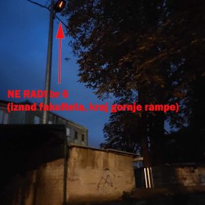 Zašto se štedi na djeci, studentima, na građanima i dopušta takvo stanje koje je sve gore, mrak je sve veći, do prije 2 tjedna je još radila jedna (od 4 lampe) na Tehničkom fakultetu ali je i ta očito pregorila.