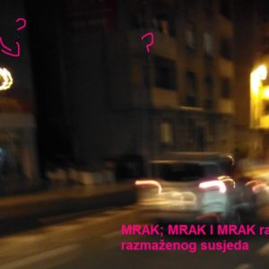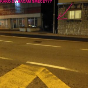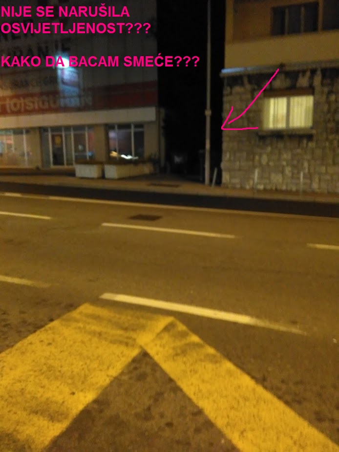 Sada je ovdje mračno, tu se nalaze kontejneri za običan otpad i reciklažu, ja u mraku ne vidim otvor za papir, pogađam gdje je dok mi papir ili plastika pada na pod. Neki dan sam u tom mraku stao u govno psa jer “susjedu smeta svjetlo u sobi” a mrak je “kao u gu**ici”. Dajte molim vas.