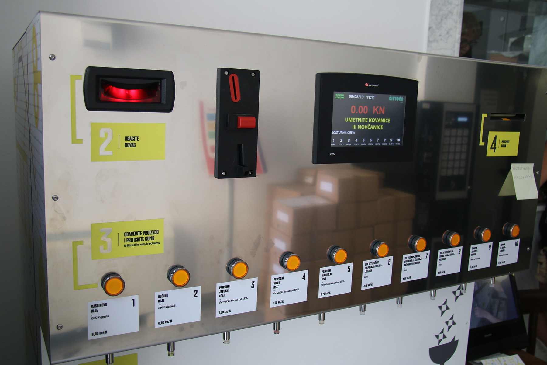 Koristeći bezambalažni samoposlužni aparat Bert, građani uz gotovinsko plaćanje mogu nabaviti prirodne i kvalitetne proizvode – ekstra djevičansko maslinovo ulje (80kn/L), bučino ulje (70kn/L), jabučni ocat (10kn/L), vinski ocat (10kn/L), alkoholni ocat (7kn/L), biodeterdžent za pranje rublja (45kn/L), biološko višenamjensko sredstvo za čišćenje (40kn/L), biodeterdžent za pranje suđa (35kn/L) te biošampon za kosu na bazi lavande (170kn/L), ali bez dodatne ambalaže, koju kupci donose sami.