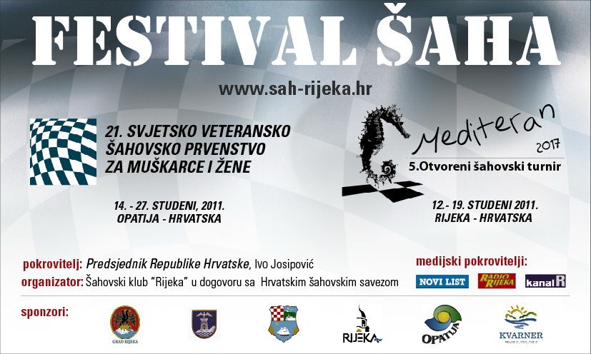 Centralni događaj Festivala šaha je 21. veteransko prvenstvo svijeta koje će se od 14.-27. studenog održati u Opatiji u kongresnom centru Tamaris – Milenij Grand hotelu 4. opatijska cvijeta. U konkurenciji muškaraca do sada je prijavljeno 212 igrača iz 43 zemlje svijeta od čega 15 velemajstora i ukupno 85 igrača sa titulom. Prvi nositelj turnira je velemajstor Vaisser Anatoly (FRA) elo rejtinga 2555 bodova. U vrlo jakoj konkurenciji od 15 velemajstora i 29 međunarodnih majstora nalazi se 12 Hrvatskih igrača šanse za visok plasman imaju velemajstori Mišo Cebalo (veteranski prvak svijeta iz 2009.) i Vlatko Kovačević te legenda riječkog šaha međunarodni majstor Josip Rukavina. U konkurenciji žena prijavljene su 42 igračice iz 12 zemalja svijeta, a jedina Hrvatska igračica na turniru je riječanka Nataša Rakipov. Prvo ime turnira je legendarna gruzijska velemajstorica Nona Gaprindašvili, prvakinja svijeta od 1962.-1978.godine.