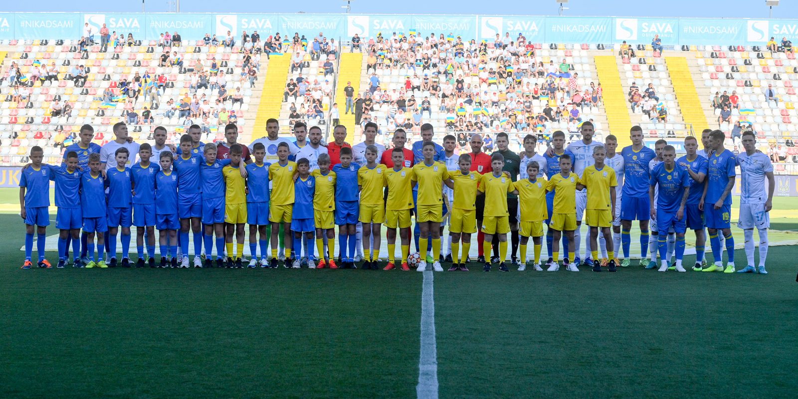 Stadion je bio obojan u plavo-žutu boju koja krasi ukrajinsku zastavu, a ukrajinsku himnu prepunu emocija uoči utakmice izvela je Svitlana Tarabarova. S nogometašima Rijeke i Ukrajine na travnjak su izašli mališani Nikita i Andrii koji su svoj dom u Ukrajini zamijenili Rijekom.