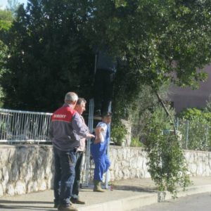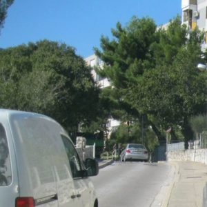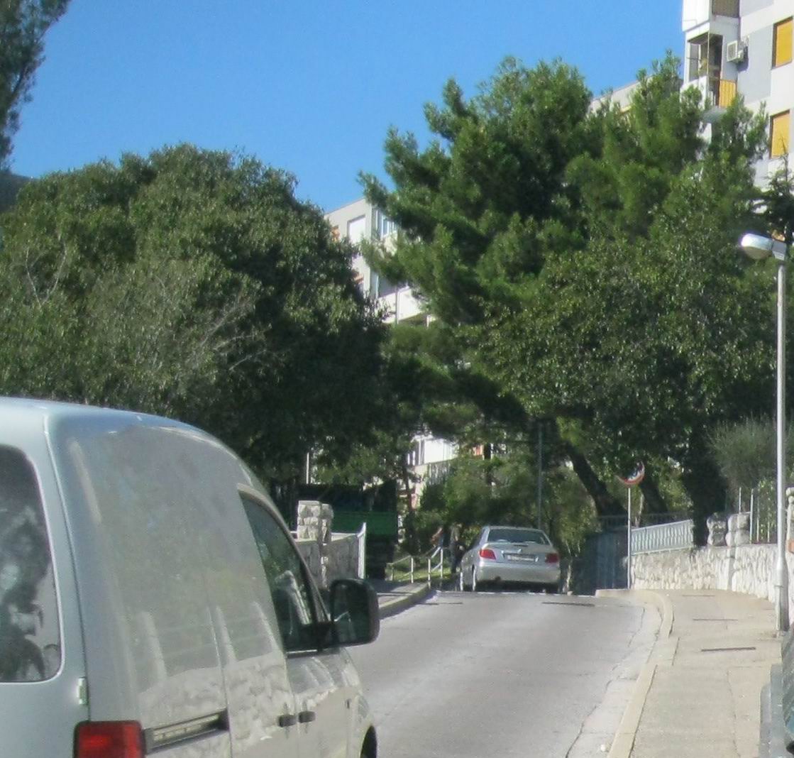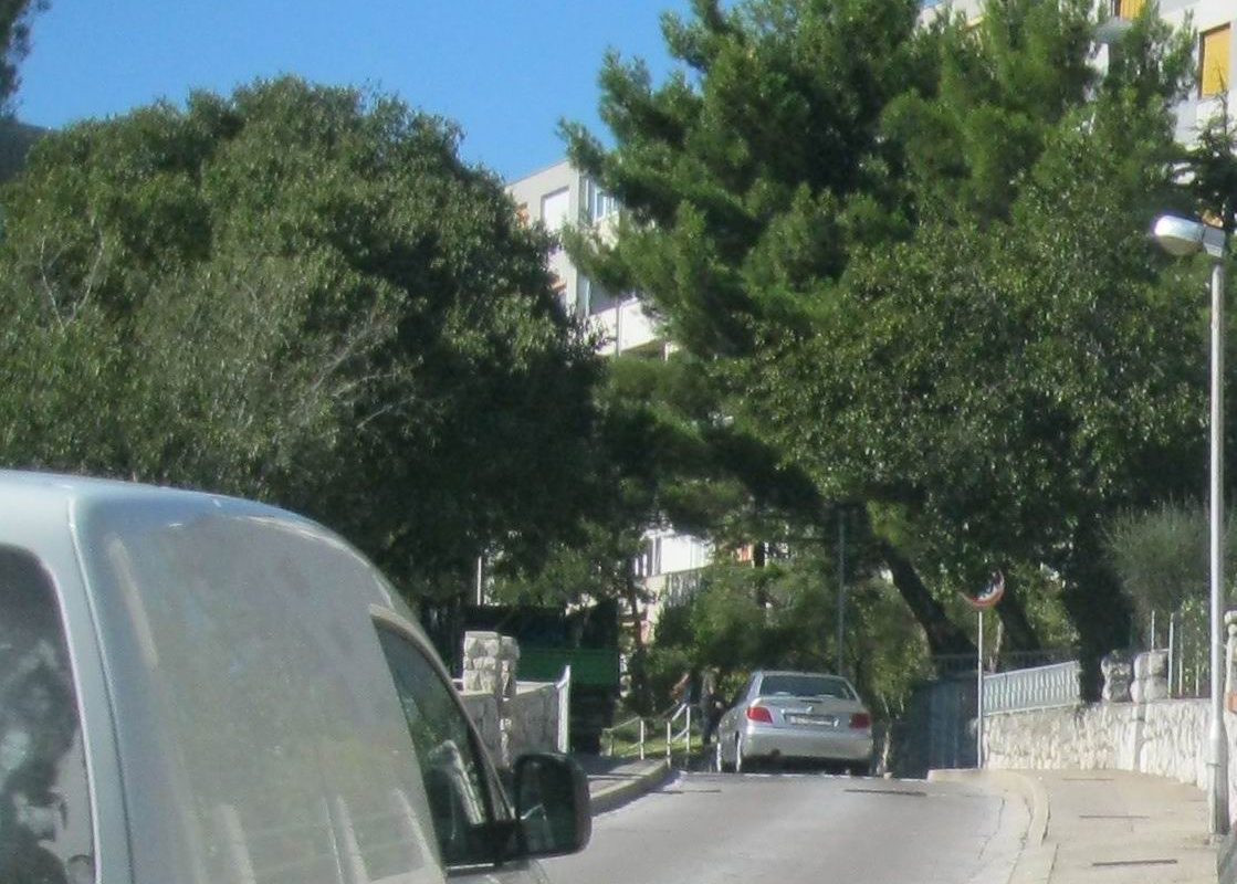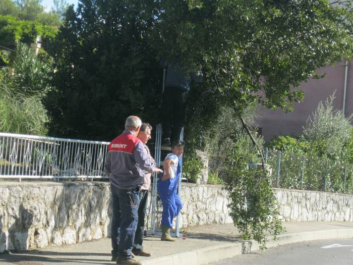 Akcija rezanja u tijeku, te nevidljivi znak, skriven u granama lovora, vidi mu se samo stup, prije rezidbe.