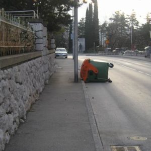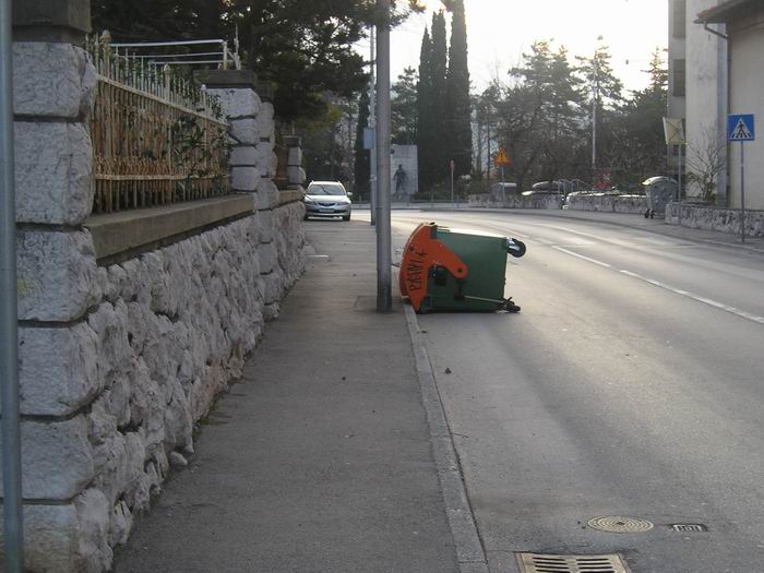 “Tetrapak kontejner” ( s narančastim poklopcem su za skupljanje ambalaže u tetrapaku) na boku u Kvaternikovoj ulici.
