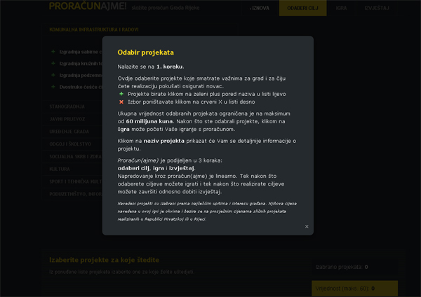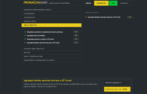 Ova edukativna igra nudi pojednostavljen prikaz stavki riječkog proračuna za 2011. godinu, odnosno popis i opis različitih područja i djelatnosti koje se financiraju iz gradskog proračuna.