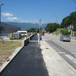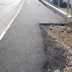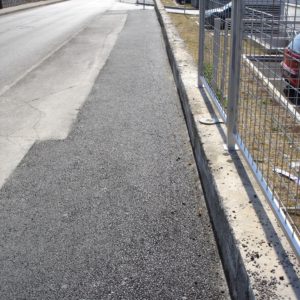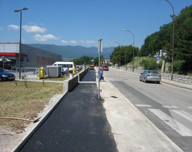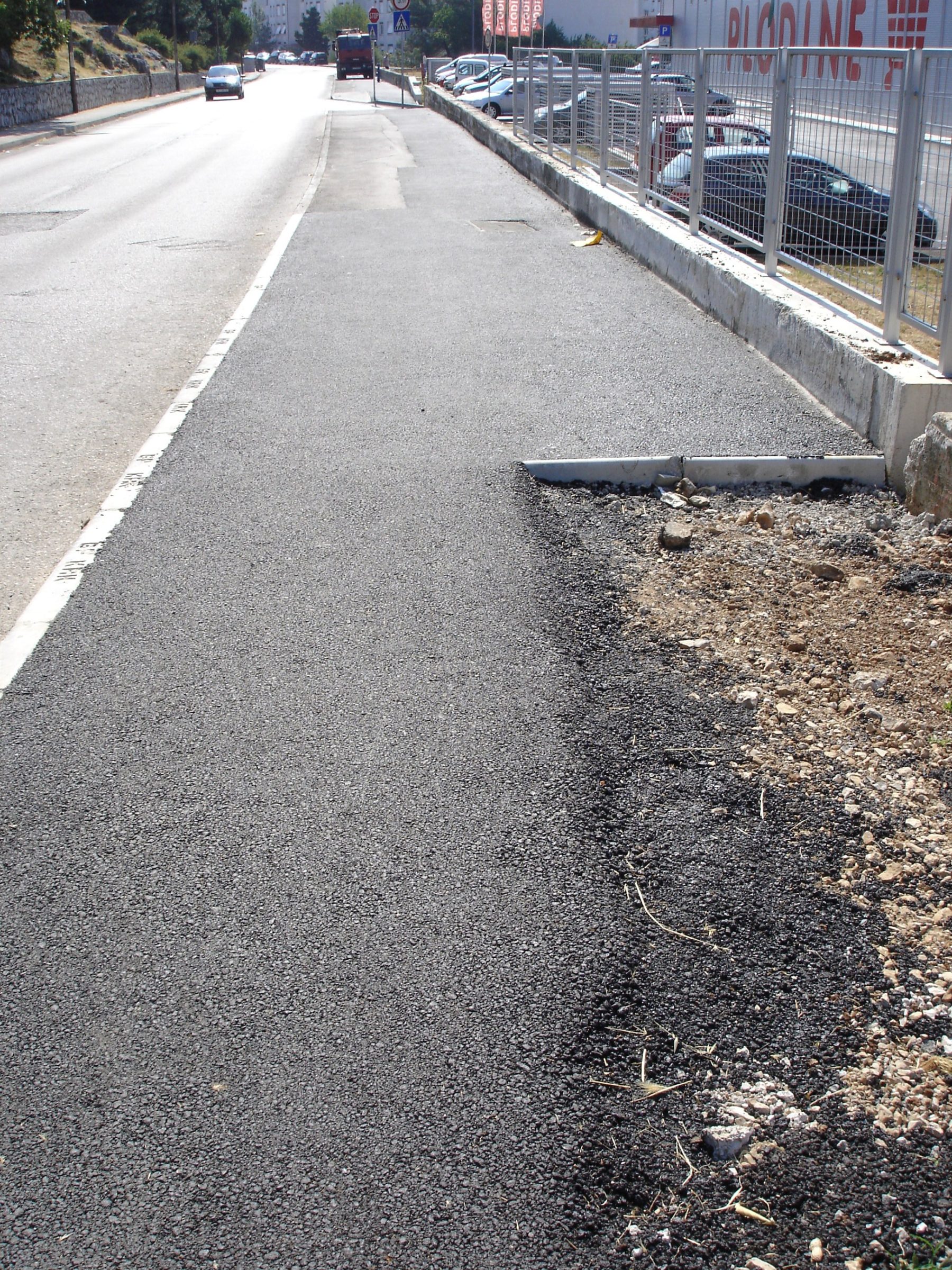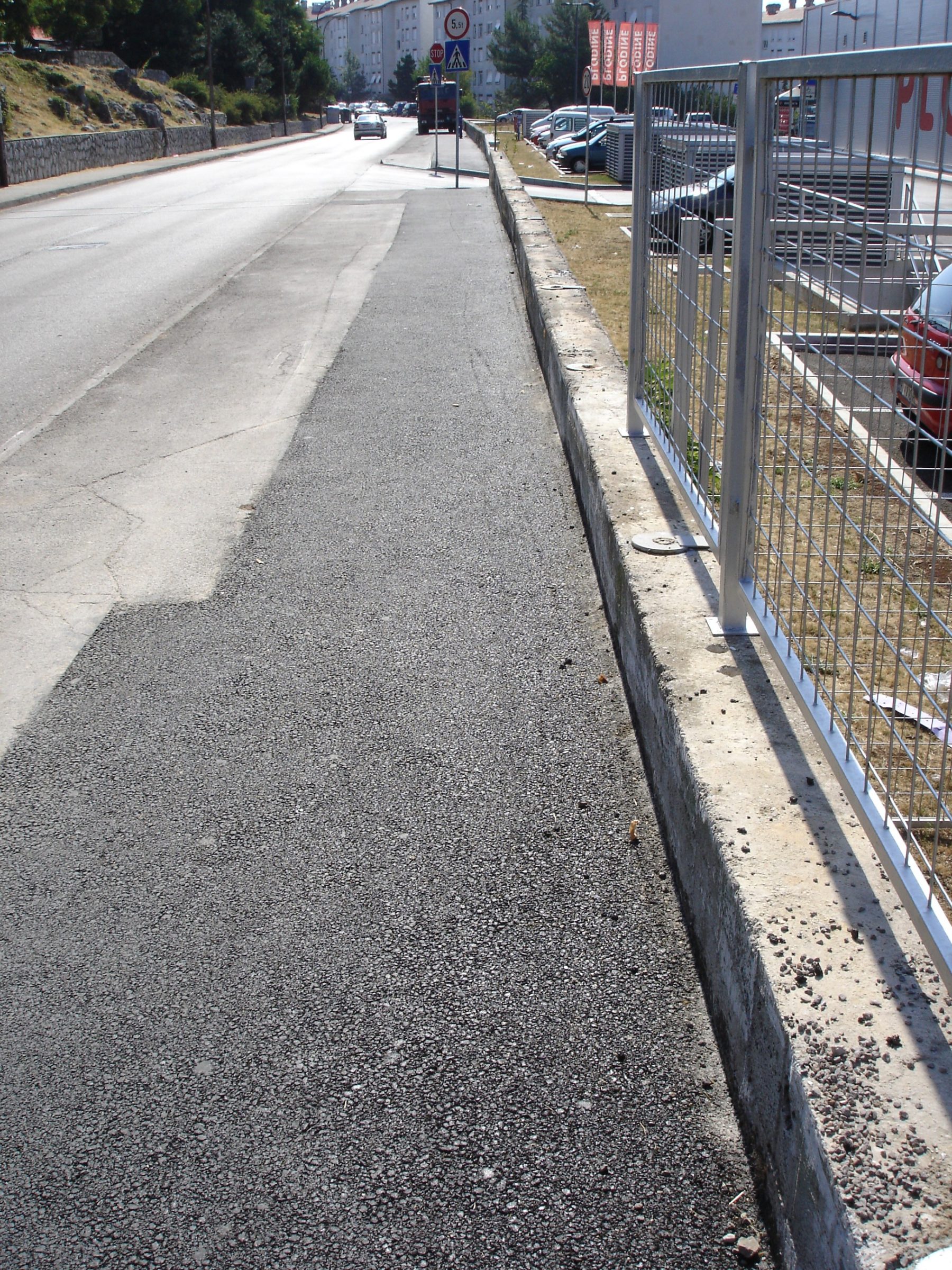 Prilikom završetka građevinskih radova oko trgovačkog centra Plodine nogostup je asfaltiran samo do polovine, a druga polovina je bila posuta pijeskom koji se rasipao po nogostupu i cesti.
