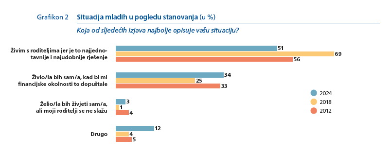 → Postotak mladih koji žive sami povećao se u odnosu na 2018. godinu, no unatoč tome mladi se i dalje najviše uzdaju u obiteljske ekonomske resurse pa polovica njih živi s roditeljima jer im je to najjednostavnije i komotno rješenje.