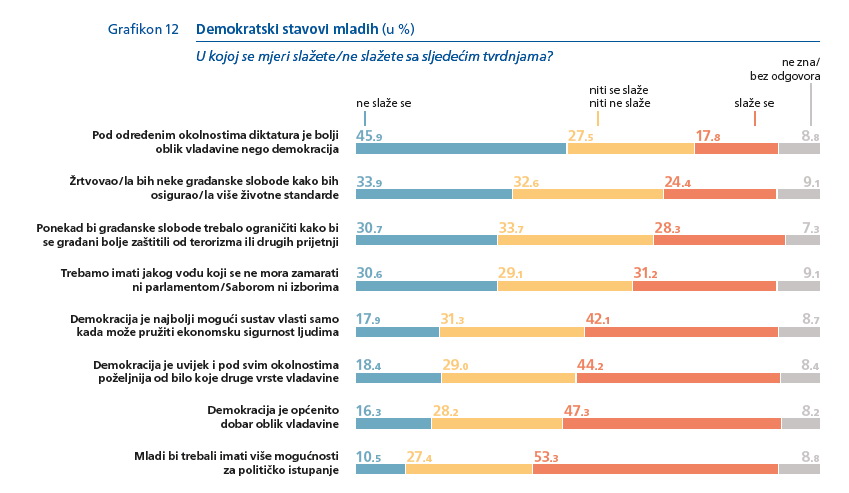 Na individualnoj razini primjetan je značajan odmak od tradicionalnih vrijednosti, posebno u vezi s brakom i djecom. Iako se jedan dio mladih distancira od tradicionalističke vrijednosne matrice vezane za privatni život, ovu tendenciju treba potvrditi u budućim istraživanjima. Unatoč nekim pomacima u smjeru liberalnog vrijednosnog pola, poput blagog porasta u opravdavanju pobačaja i homoseksualnosti, i dalje je prisutna nedemokratska orijentacija kod značajnog dijela mladih: izražavanje uvjetne podrške demokraciji te podrška autoritarnom vođi. Ova podrška političkom autoritarizmu proizlazi iz percepcije neučinkovitih javnih i političkih institucija čiji rad nije prepoznat kao pouzdan.