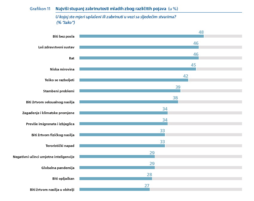 → Među brigama i strahovima mladih najzastupljeniji su oni koji se odnose na kvalitetu osobne egzistencije, prije svega (ne)zaposlenost i osobno zdravlje.