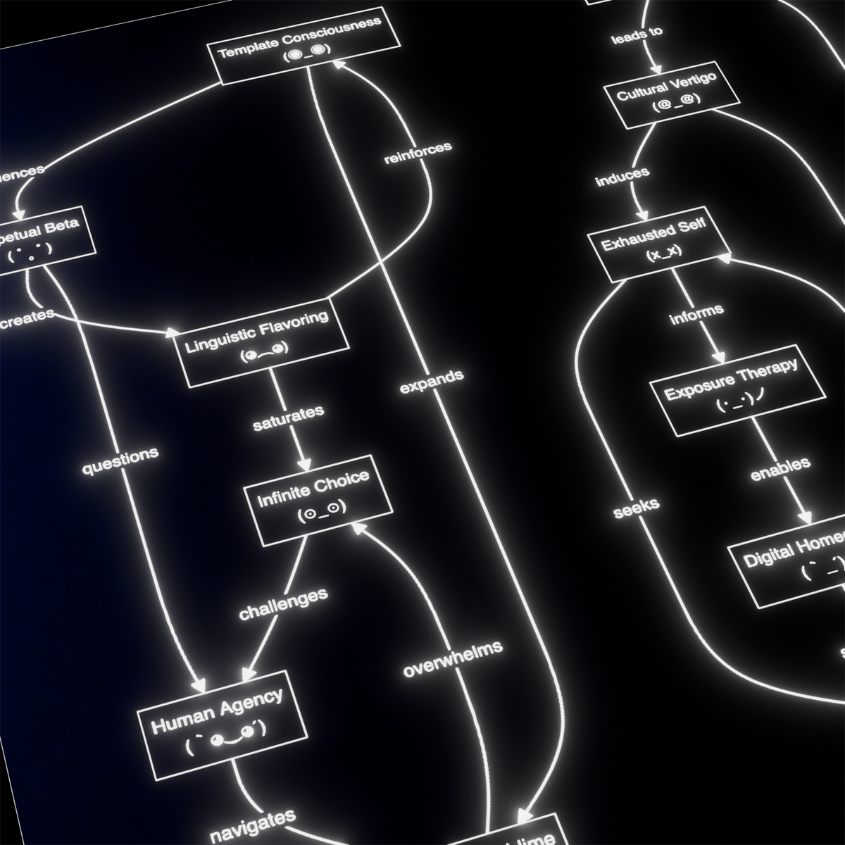 Osjećaj dezorijentiranosti karakterističan za suvremenu medijsku kulturu očituje se u trilogiji Silvije Dal Dosso The Future Is Weird AF, u kojoj sintetička verzija glasa Adama Curtisa priziva distopijski pejzaž današnje medijske stvarnosti, naseljen „uskrslim“ slavnim osobama, virtualnim influencerima i odnosima između ljudi i botova. U radu The Bastard Fields, kolektiv Most Dismal Swamp konstruira gust, halucinatoran ambijent u kojem se digitalni višak i psihička nestabilnost stapaju u neprijateljski krajolik.