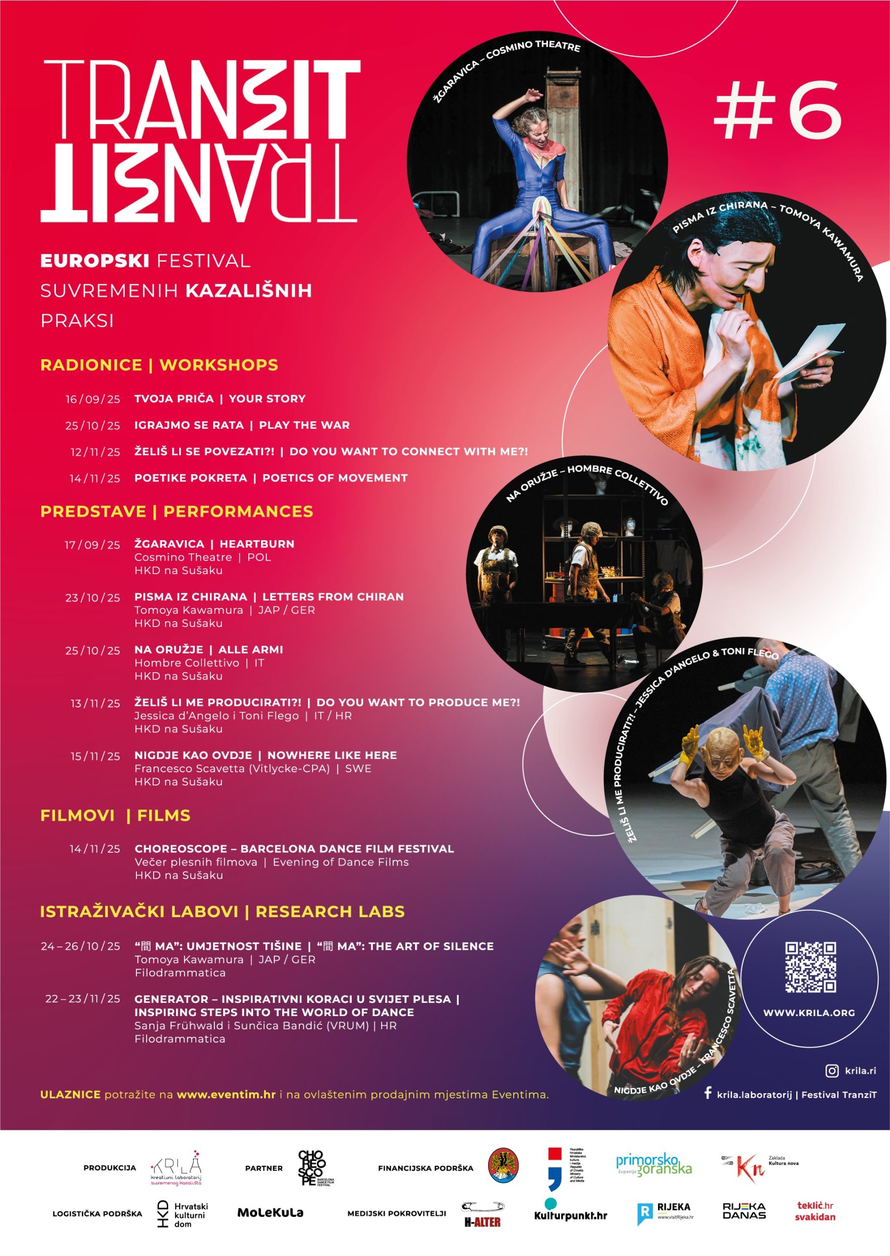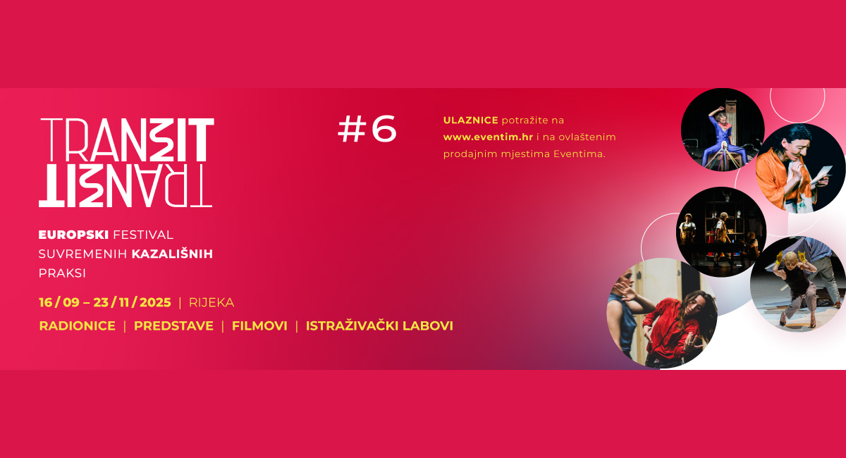 TranziT #6 – europski festival suvremenih kazališnih praksi od 16. rujna do 23. studenog ponovno će ispuniti Rijeku bogatim i raznovrsnim programom. Šesto izdanje donosi snažne i aktualne autorske predstave domaćih i međunarodnih umjetnika, radionice za publiku, inspirativne istraživačke labove te večer plesnih filmova u suradnji s renomiranim festivalom Choreoscope iz Barcelone.