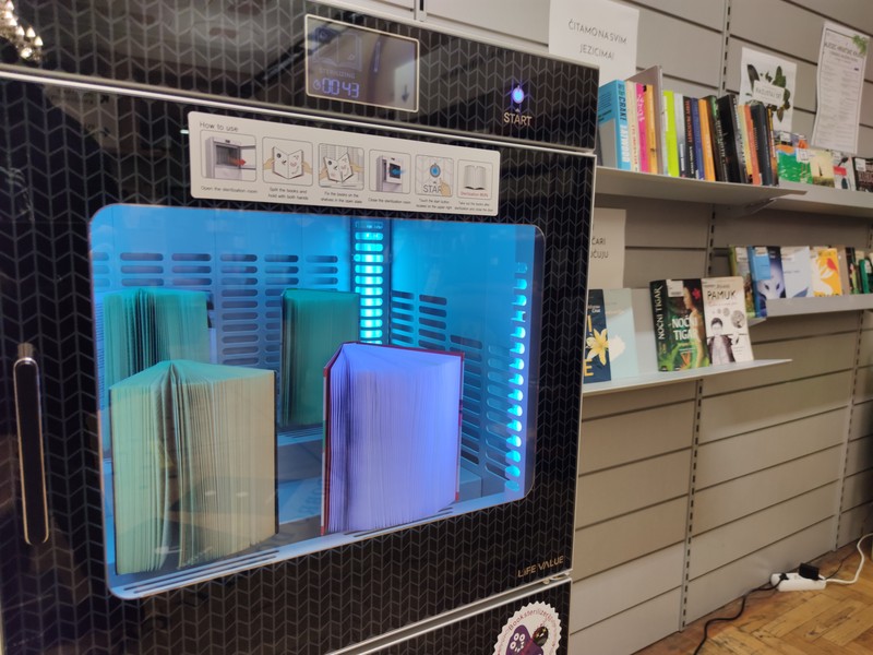 Riječ je o uređaju koreanske tvrke LIVA pod nazivom LIVA EBS-401 koji uz UV lampe zadužene za uništavanje virusa koristi i strujanje zraka za uklanjanje prašine s knjiga. Proizvođač garantira efikasnost pri uklanjanju životinjica (uši, grinja…), bakterija i virusa (specifično i koronavirus – COVID-19), što će značajno unaprijediti čistoću knjiga i sigurnosni standard.